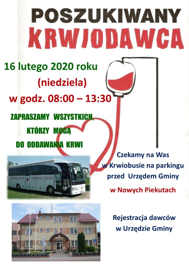 W niedzielę, 16 lutego w Nowych Piekutach odbędzie się pierwsza w tym roku akcja krwiodawstwa.