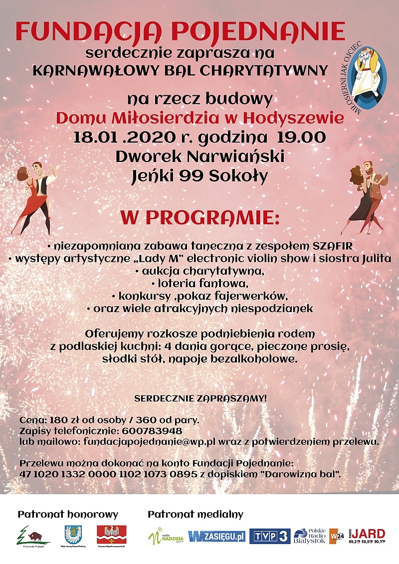 Fundacja Pojednanie serdecznie zaprasza na Karnawałowy Bal Charytatywny na rzecz budowy Domu Miłosierdzia w Hodyszewie, który odbędzie się 18 stycznia 2020 roku o godzinie 19:00 w Dworku Narwiańskim w Jeńkach. Patronat medialny nad wydarzeniem objął portal wysokomazowiecki24.
