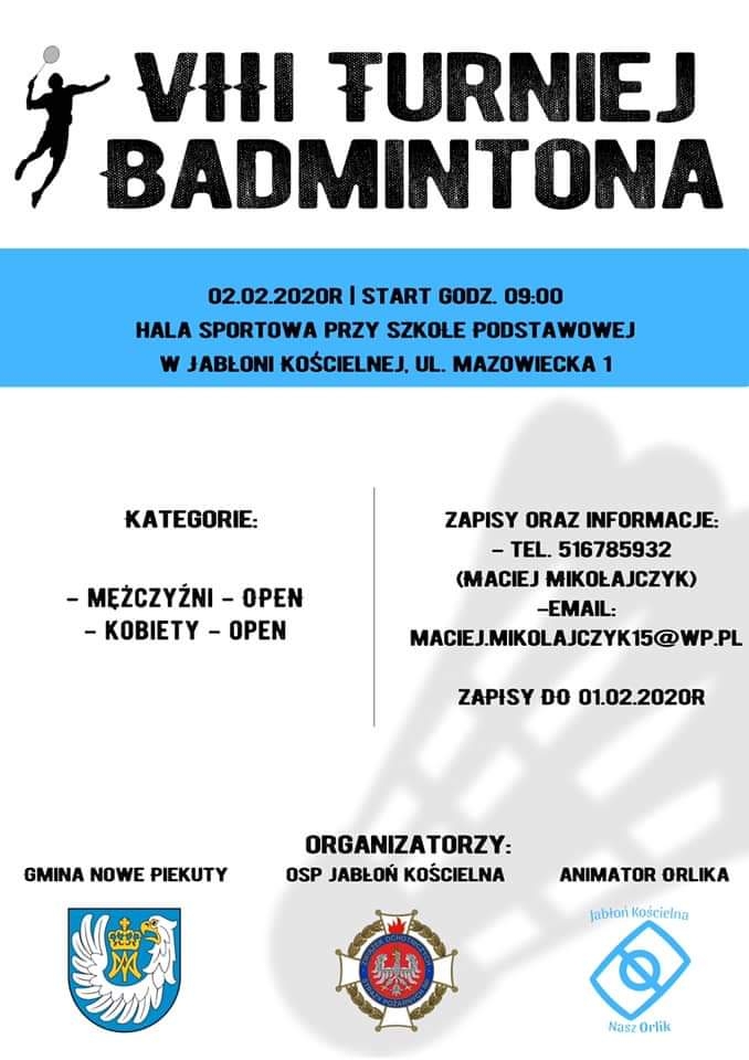 Wójt Gminy Nowe Piekuty, Zarząd OSP Jabłoń Kościelna oraz Animator Orlika w Jabłoni Kościelnej zapraszają na VIII Turniej Badmintona.