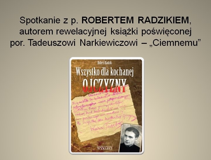 Spotkanie autorskie z Robertem Radzikiem, autorem książki pt. "Wszystko dla kochanej Ojczyzny", poświęconej postaci por. Tadeusza Narkiewicza „Ciemnego” odbędzie się 15 grudnia w Hodyszewie.