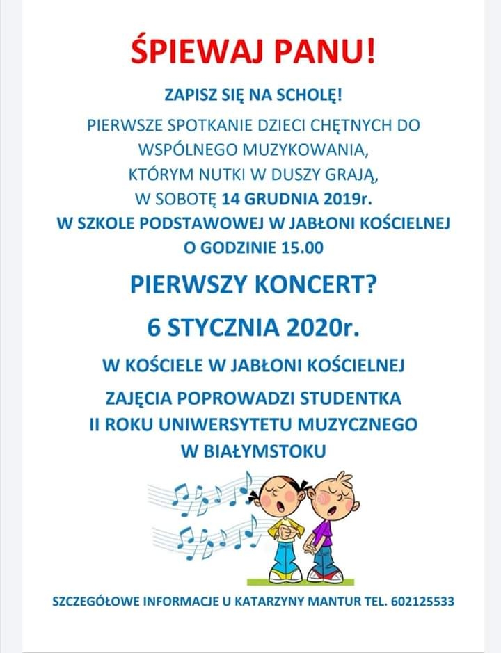 Szkoła Podstawowa im. Jana Pawła II w Jabłoni Kościelnej zaprasza chętne dzieci do zapisania się do scholi.