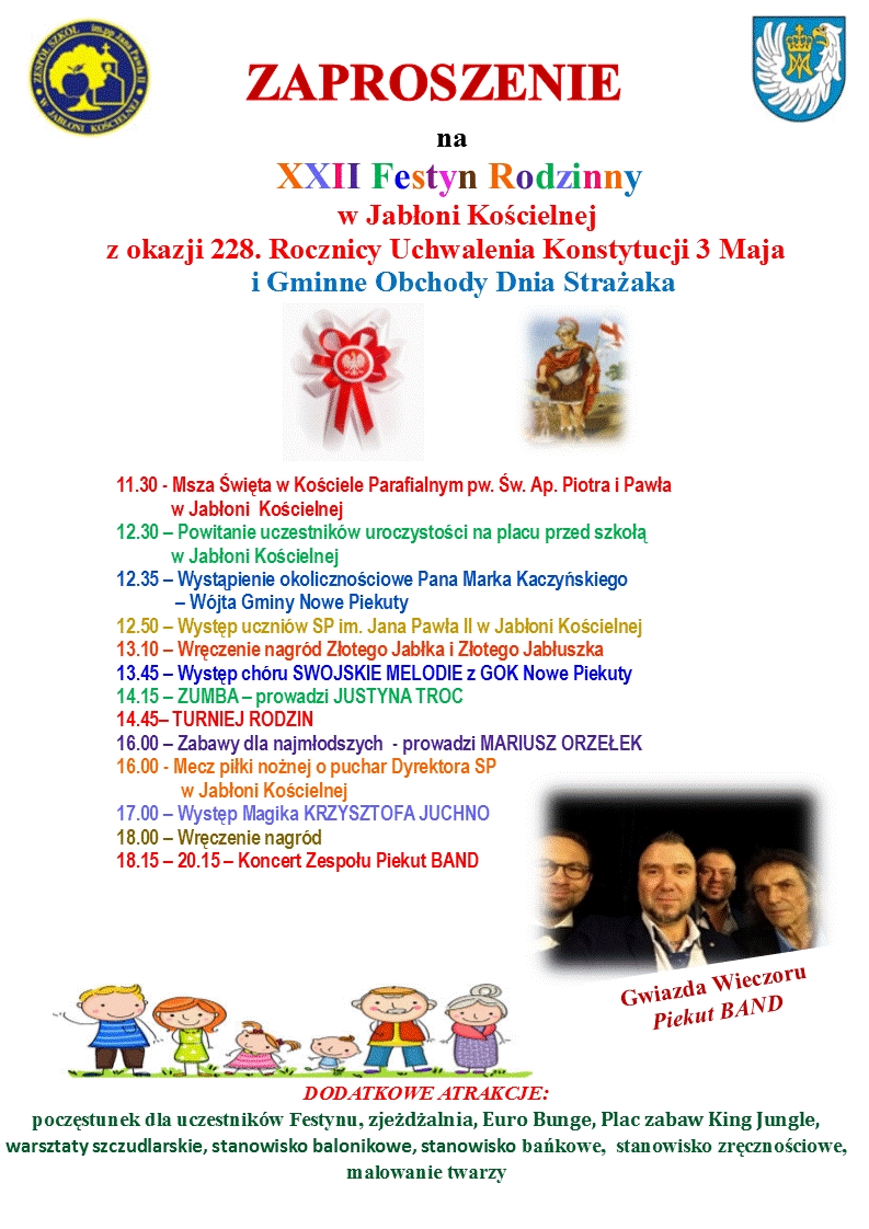 Szkoła Podstawowa im. Jana Pawła II w Jabłoni Kościelnej serdecznie zaprasza na XXII Festyn Rodzinny z okazji 228. Rocznicy Uchwalenia Konstytucji 3 Maja połączony z Gminnymi Obchodami Dnia Strażaka. Wydarzenie odbywać się będzie w piątek, 3 maja w Jabłoni Kościelnej.