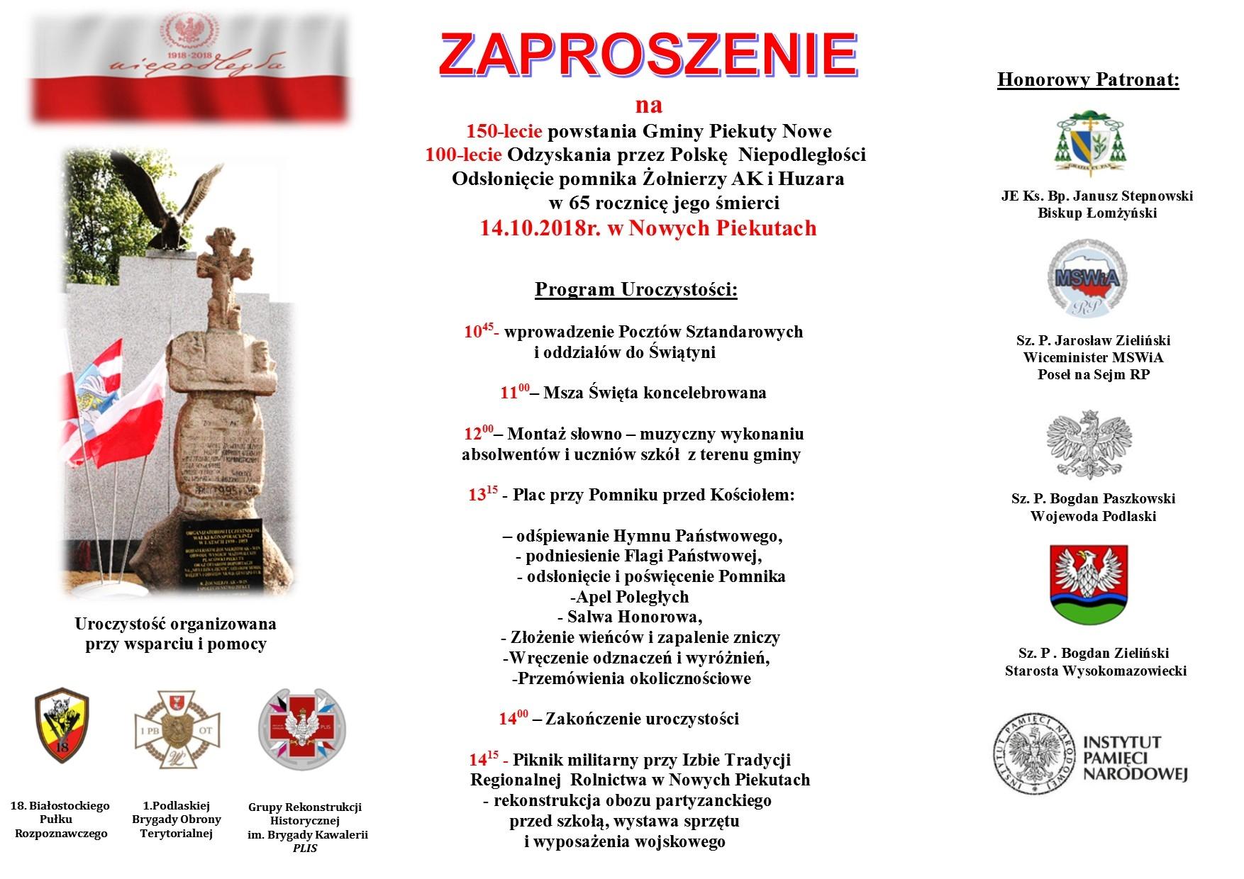 Obchody 150-lecia powstania Gminy Piekuty Nowe, 100–lecia Odzyskania przez Polskę Niepodległości oraz odsłonięcie i poświęcenie Pomnika Żołnierzy Armii Krajowej i Kapitana Kazimierza Kamieńskiego p.s. Huzar odbędą się w niedzielę, 14 października w Nowych Piekutach.