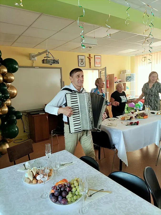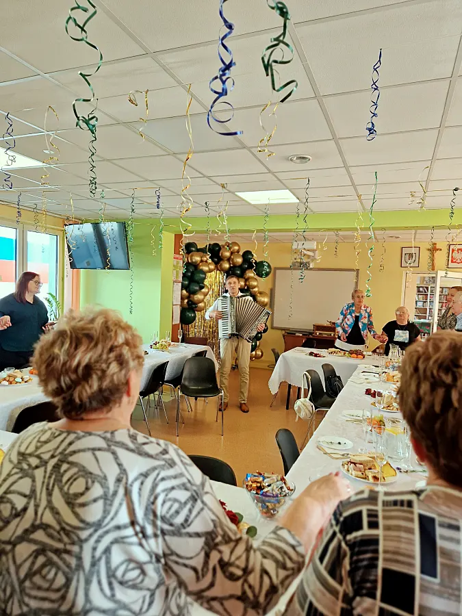 Za oprawę muzyczną spotkania odpowiadał Wojciech Ostrowski, który swoimi umiejętnościami gry na akordeonie stworzył niezwykle energiczną atmosferę. Dźwięki popularnych melodii szybko wypełniły salę Gminnego Ośrodka Kultury, zachęcając seniorów do aktywnego udziału w zabawie. Jak relacjonują organizatorzy, wspólnym śpiewom i tańcom nie było końca, a spotkanie przebiegło w serdecznej i gwarnej atmosferze.