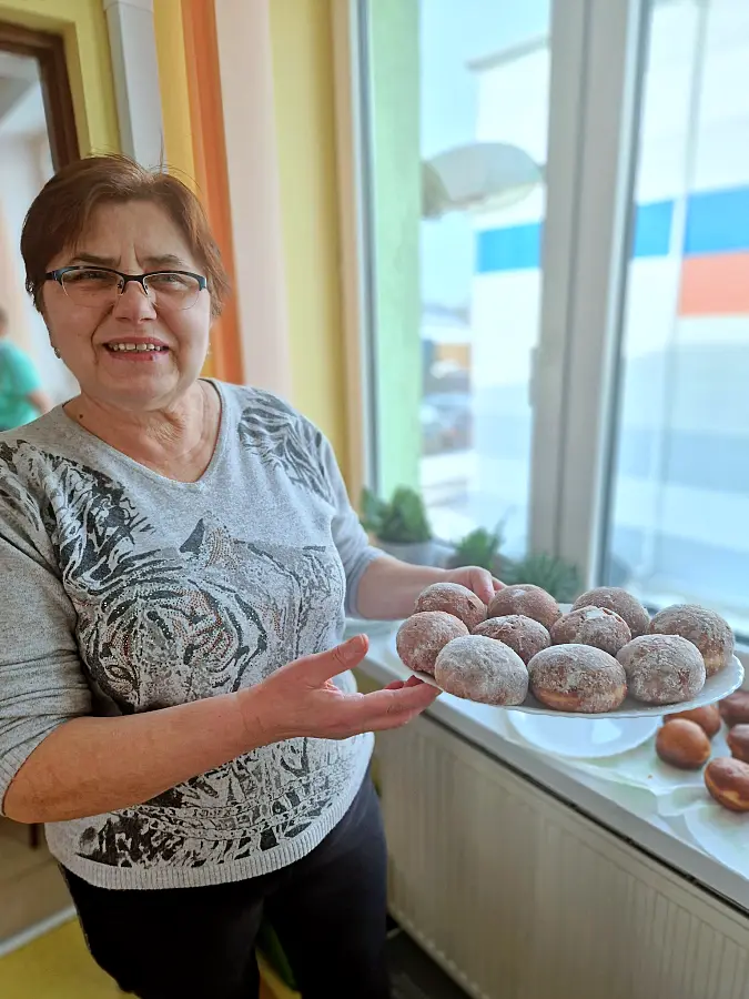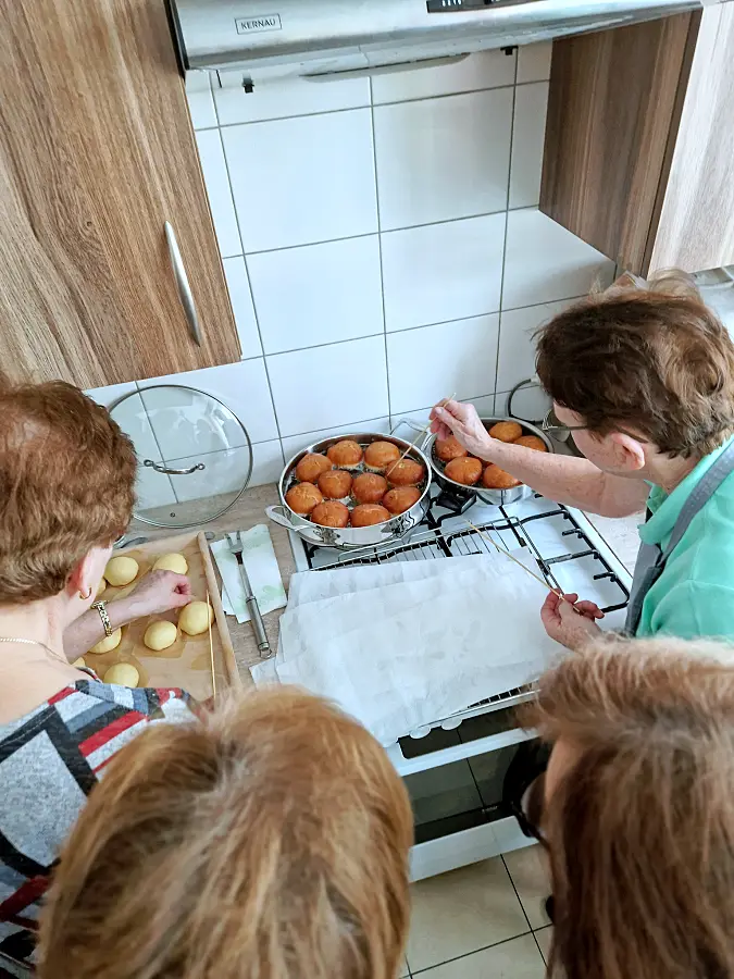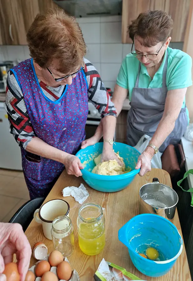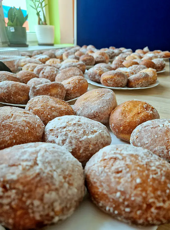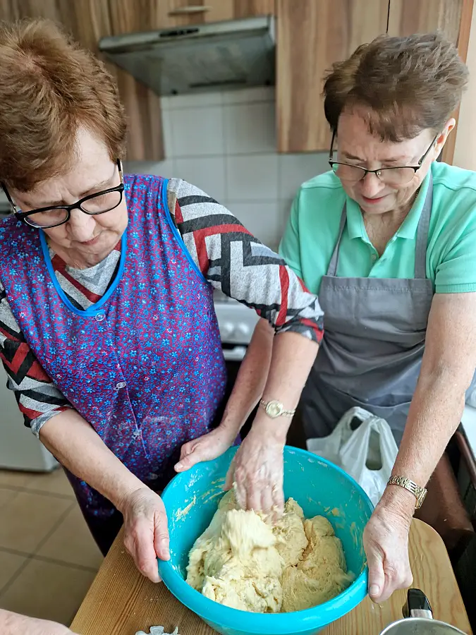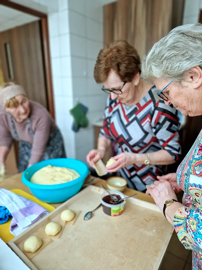 Wydarzenie miało charakter warsztatowy i integracyjny, angażując seniorów w cały proces powstawania słodkich przekąsek. Prace rozpoczęły się od przygotowania ciasta. Na stołach pojawiły się niezbędne składniki: mąka, jajka, mleko oraz drożdże. Uczestnicy spotkania podzielili się zadaniami – część osób zajmowała się wyrabianiem ciasta w miskach, inni formowali z niego idealnie okrągłe porcje gotowe do smażenia.