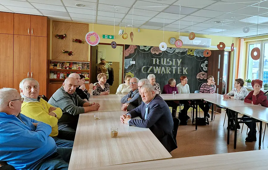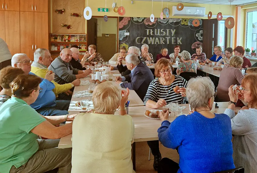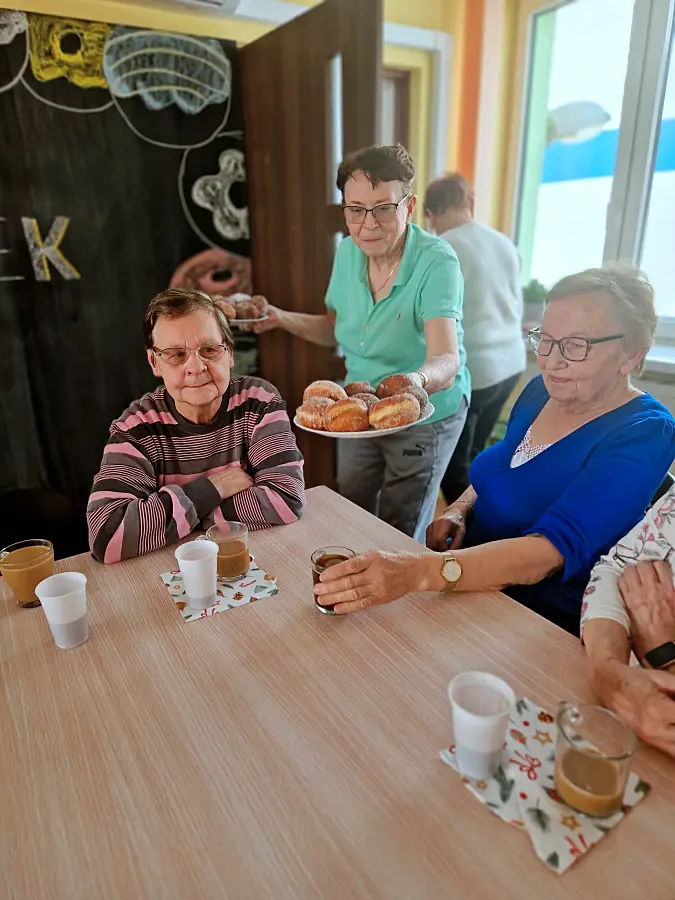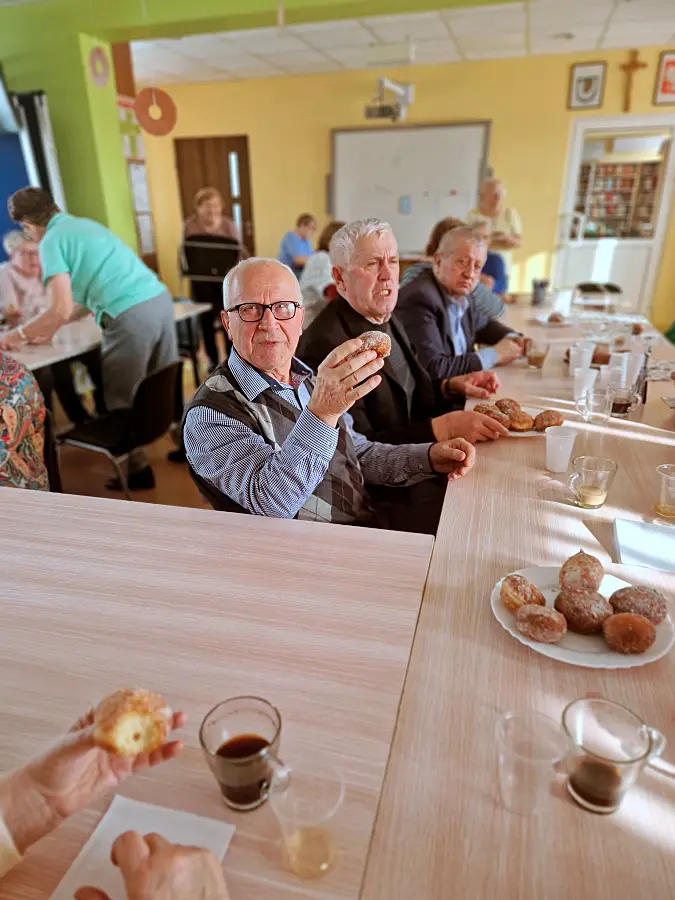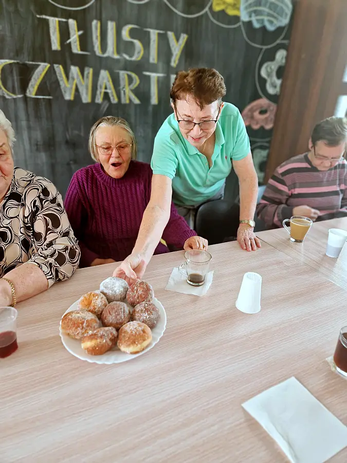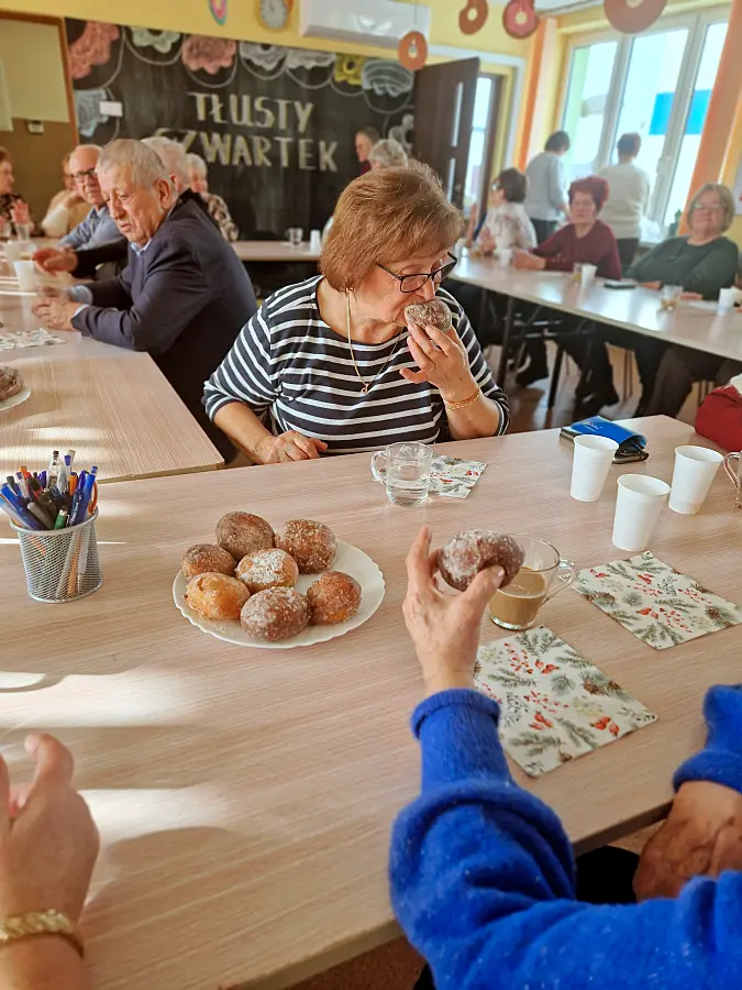 Finałem spotkania była wspólna degustacja przygotowanych smakołyków. W sali udekorowanej tematycznymi napisami „Tłusty Czwartek” oraz papierowymi pączkami zawieszonymi pod sufitem, seniorzy mogli spróbować efektów swojej pracy przy kawie i herbacie.