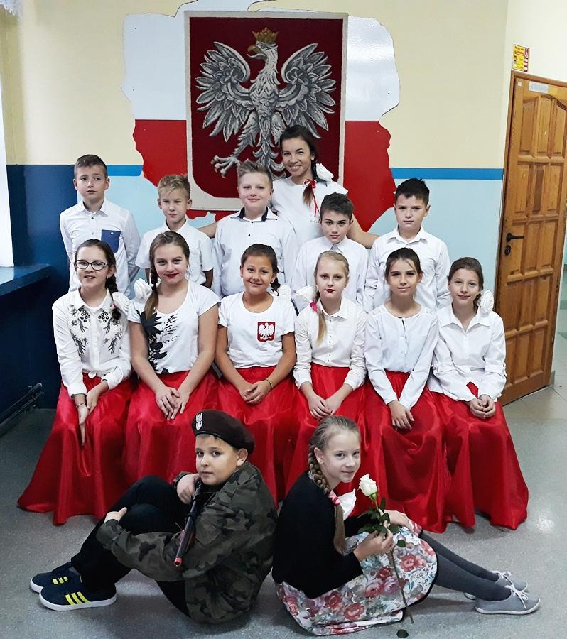 Iwona Szymborska nauczyciel Szkoły Podstawowej w Jabłoni Kościelnej: Z okazji 100 Rocznicy Odzyskania Niepodległości Młodzieżowy Sejmik Województwa Podlaskiego zorganizował konkurs fotograficzny „Kotylion dla Niepodległej”. Uczniowie klasy 5a wraz z wychowawczynią postanowili wziąć udział w tym konkursie i zgłosili zdjęcie zrobione podczas uroczystości obchodów Dnia dla Niepodległej w naszej szkole. Tego dnia odbył się koncert pieśni patriotycznych, na którym zaśpiewali pieśń „Białe róże” i przygotowali scenkę obrazującą tęsknotę dziewczyny za Jasieńkiem. Na zdjęciu uwieczniono stylizację klasy przygotowaną z tej okazji będącą wyrazem ich postawy patriotycznej.