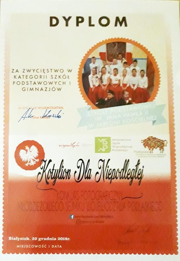 Uczniowie ze Szkoły Podstawowej im. Jana Pawła II w Jabłoni Kościelnej zajęli pierwsze miejsce w konkursie Kotylion dla Niepodległej organizowanym przez Młodzieżowy Sejmik Województwa Podlaskiego.
