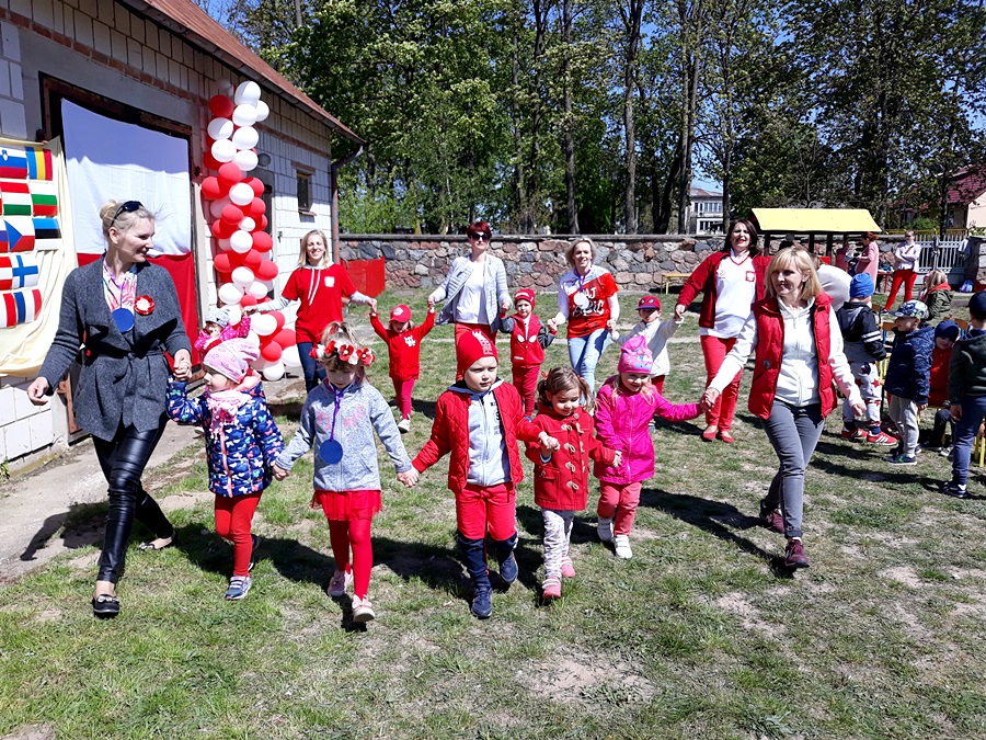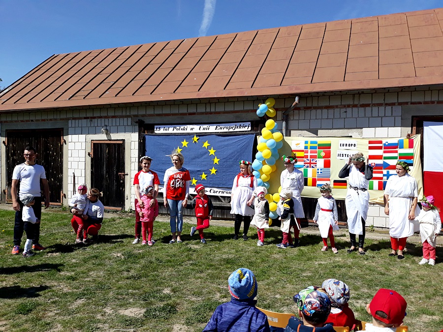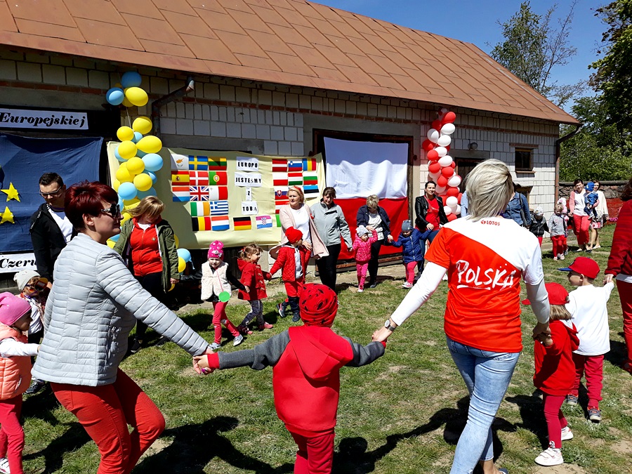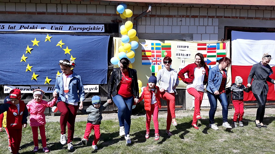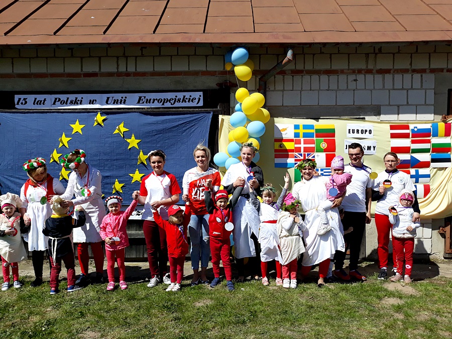 Jak informują nas organizatorzy: - Rozpoczęliśmy od zaśpiewania hymnu Polski i hymnu Unii Europejskiej. Następnie odbył się główny punkt programu naszego dnia – konkursy rodzinne. Wzięły w nich udział rodziny reprezentujące Polskę, Niemcy, Grecję i Włochy. Uczestnicy, w strojach podkreślających charakter tych pastw, rzucali ziemniakami do celu, wykonywali obrazki z makaronu, ścigali się przenosząc chorągiewki oraz w wyścigu rydwanów. Nie chodziło o rywalizację, ale o dobrą zabawę, dlatego też wszystkie drużyny zdobyły medale podkreślające przynależność do Europy.