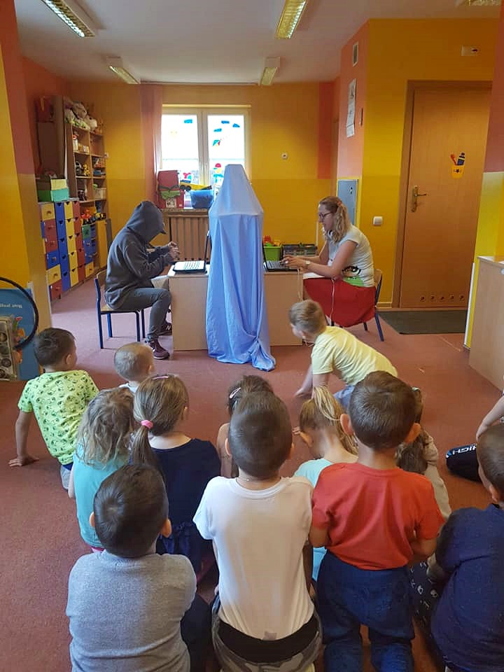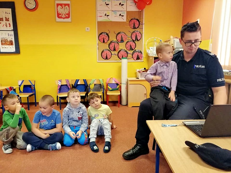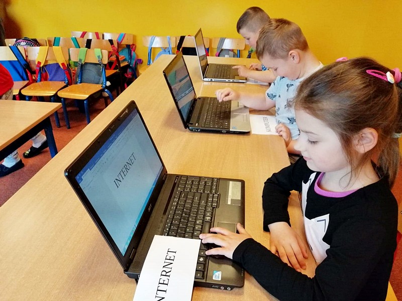 Dzieci uświadomiły sobie, że komputer nie służy tylko do rozrywki, ale może być narzędziem pracy. Panie przygotowały specjalne przedstawienie, które zobrazowało przedszkolakom, że znajomości nawiązywane w sieci mogą okazać się niebezpieczne. Mali użytkownicy nowoczesnych technologii konstruowali własne laptopy i wykonywali prace plastyczne. Słuchali historyjek i rozmawiali na temat użycia komputera, tabletu czy telefonu komórkowego w życiu codziennym. Używali różnych programów komputerowych i oglądali filmiki edukacyjne. Zaprosiliśmy również pana policjanta, sierż. sztab. Artura Łopieńskiego, który w ciekawy sposób przybliżył informacje dotyczące Internetu oraz bezpiecznego korzystania z niego.