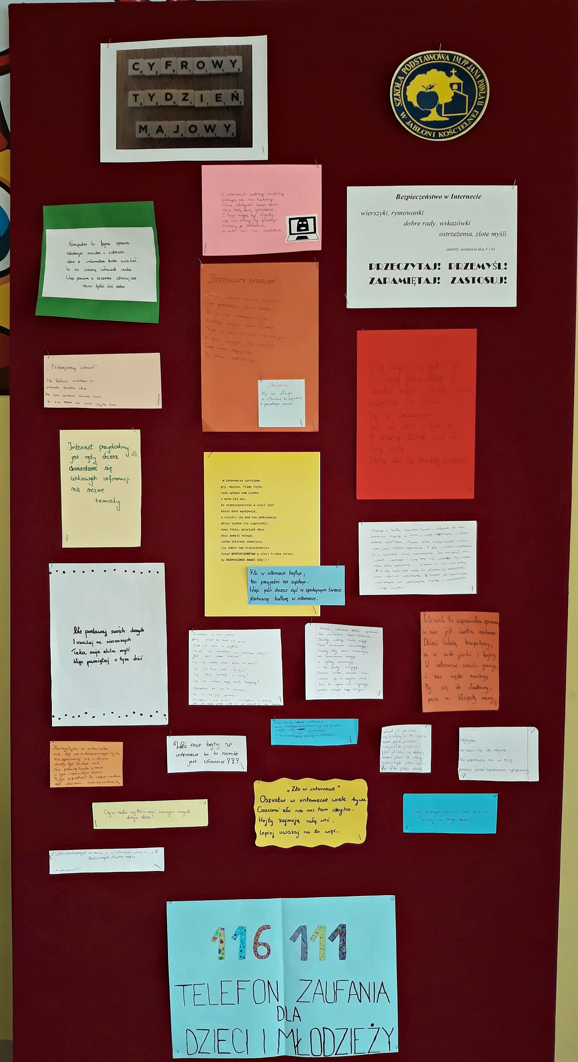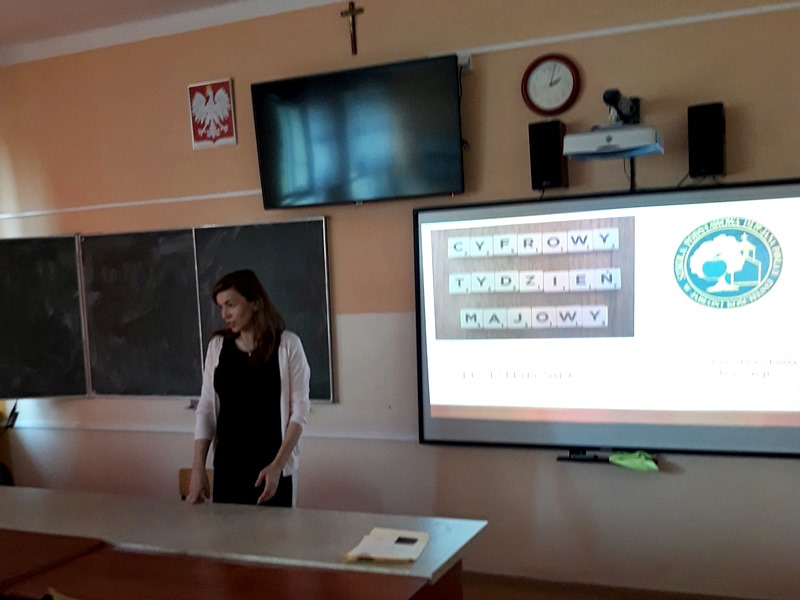 Nasze działania w szkole rozłożyliśmy w ciągu całego tygodnia nauki. Uczniowie często korzystają na lekcjach z zasobów dydaktycznych dostępnych online i mają możliwość nauki z użyciem narzędzi TIK, ale w tygodniu cyfrowym nauczyciele zwrócili szczególną uwagę na promowanie samodoskonalenia i nauki z wykorzystaniem Internetu oraz zachęcali uczniów do korzystania z dóbr kultury i z rozrywki. Odbyły się lekcje biblioteczne, lekcje wychowawcze, zajęcia warsztatowe i spotkania po południu poświęcone korzyściom płynącym z dostępności Internetu oraz zagrożeniom mogącym spotkać młodych ludzi w sieci. Wspólnie wypracowaliśmy zasady bezpiecznego poruszania się w zasobach internetowych, dowiedzieliśmy się czego nie robić, jak unikać niebezpieczeństw, chronić dane osobowe, radzić sobie z hejtem czy komunikować się z rówieśnikami w sposób kulturalny. Efektem tych aktywności jest wzrost świadomości i wiedzy młodzieży na ten temat, ale również różnego rodzaju plakaty, ulotki informacyjne, wierszyki i rymowanki oraz wystawa w szkolnej świetlicy, co przypomina codziennie naszym uczniom jak ważne jest rozsądne korzystanie z nowoczesnych technologii.
