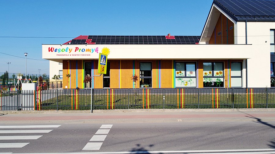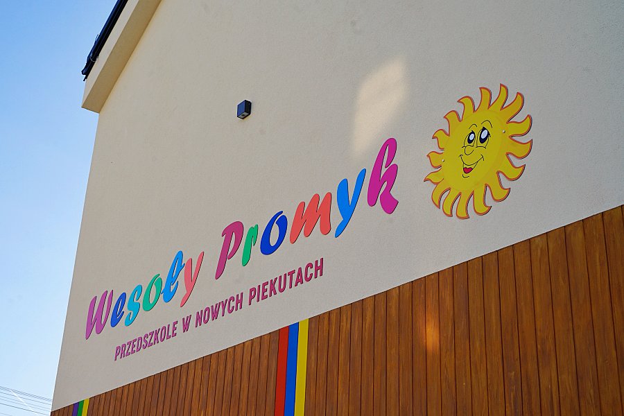 Przedszkole łącznie ze żłobkiem "Wesoły Promyk" w Nowych Piekutach jest częściowo 2-kondygnacyjne, połączone z istniejącym budynkiem szkoły podstawowej. Winda zapewnia bezpośredni dostęp do wszystkich pomieszczeń dla osób z niepełnosprawnościami. W budynku znajdują się cztery sale przedszkolne, jedna sala żłobkowa, stołówka z zapleczem kuchennym z funkcją wydawania posiłków i cateringu oraz pozostałe pomieszczenia sanitarno-higieniczne.