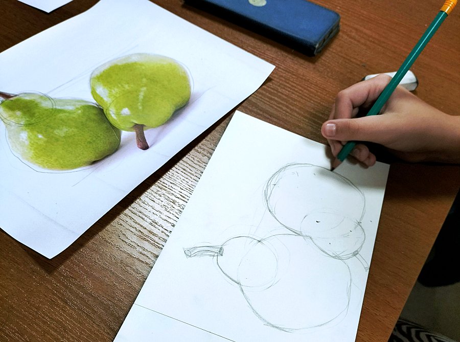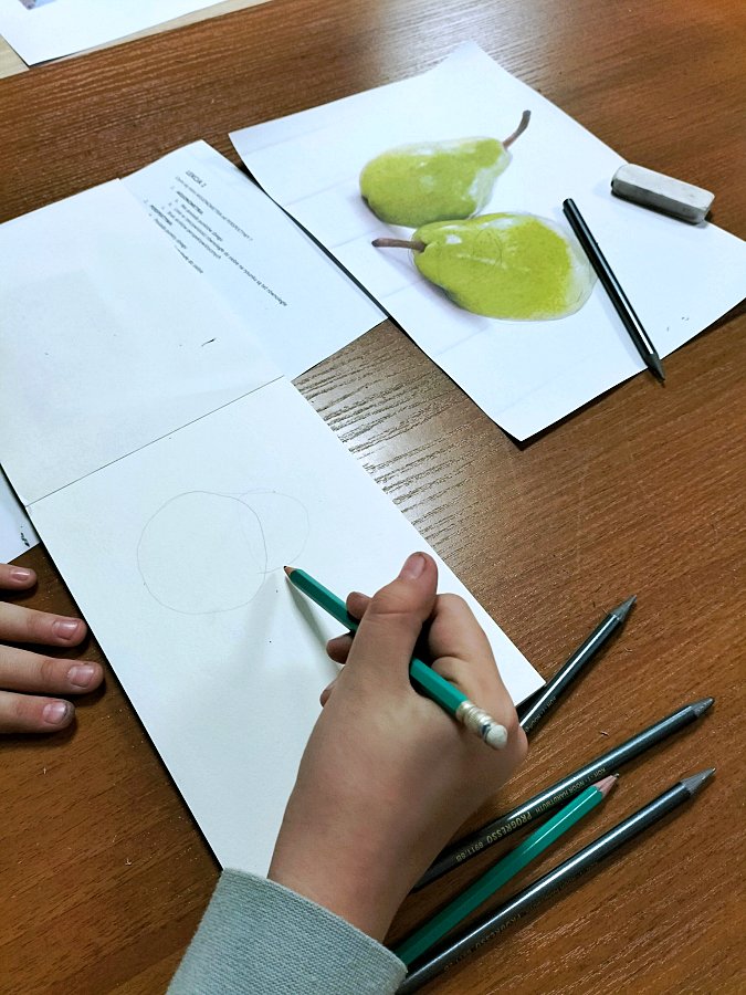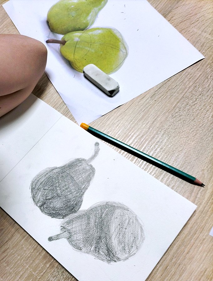 Zadanie miało na celu rozwój umiejętności obserwacji proporcji i światłocienia. Uczestnicy uczyli się, jak oddać na papierze zarówno miękkie linie owoców, jak i geometryczne kształty brył.