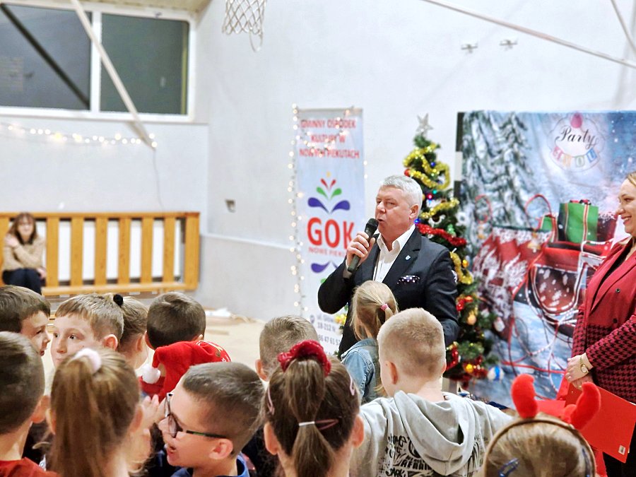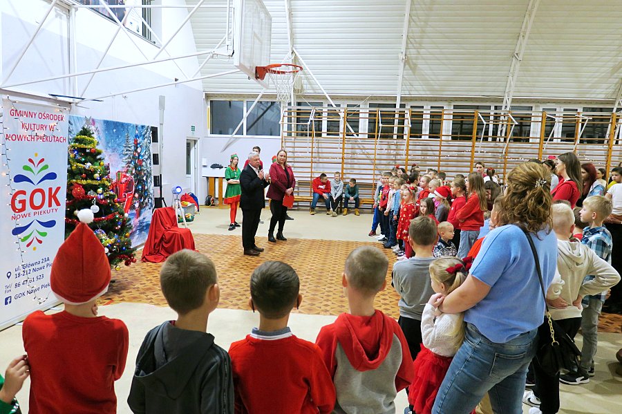 VIII Mikołajki Gminne zorganizowane 3 grudnia 2024 roku w Nowych Piekutach przyciągnęły tłumy najmłodszych mieszkańców gminy. Sala gimnastyczna Zespołu Szkolno-Przedszkolnego zamieniła się w świąteczną krainę, gdzie głównym gościem był Święty Mikołaj z workiem pełnym prezentów.