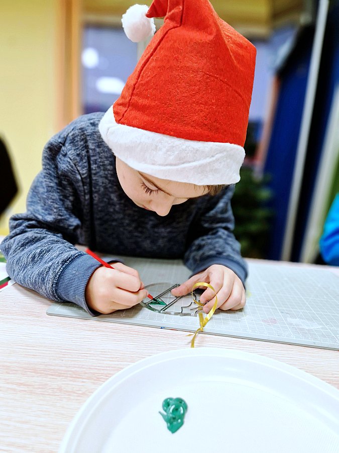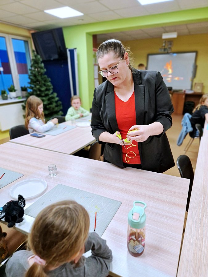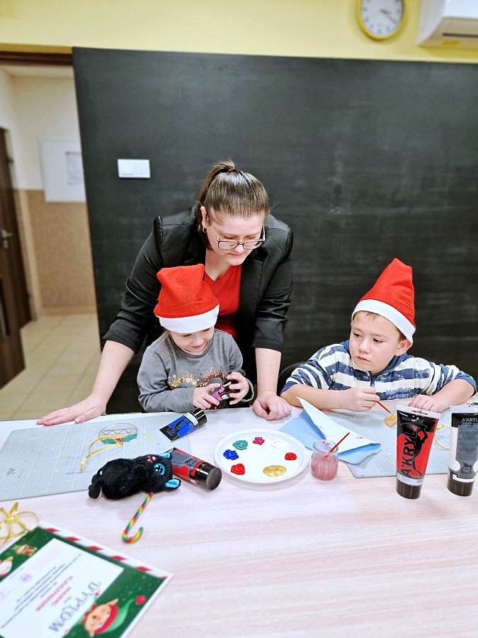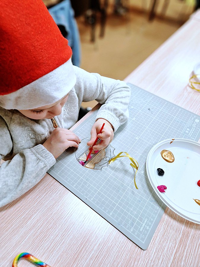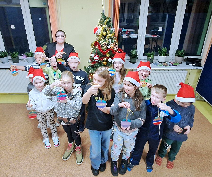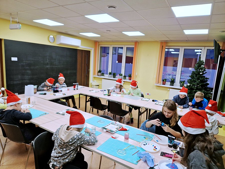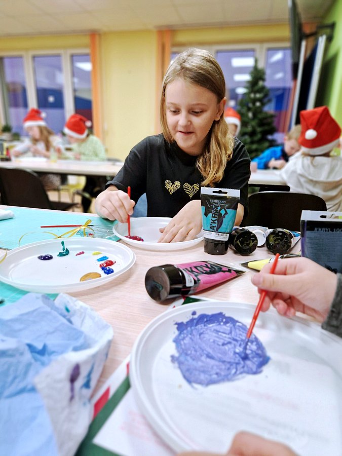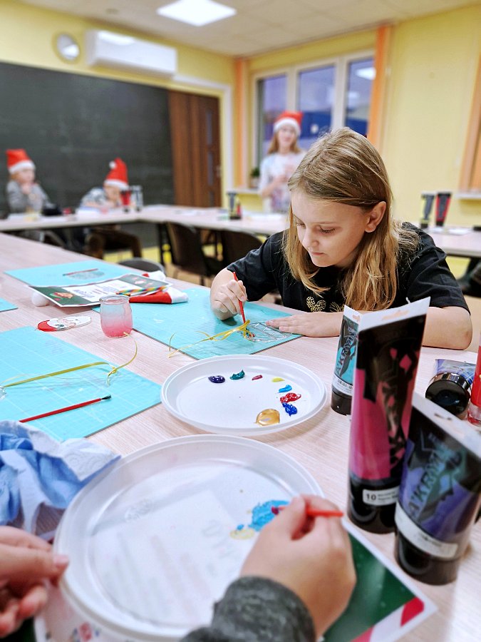 Główną częścią warsztatów były zajęcia z malowania na szkle. Dzieci poznały tajniki tej techniki artystycznej i wykorzystały zdobytą wiedzę do stworzenia własnych, niepowtarzalnych bombek choinkowych. Każda z ozdób zyskała indywidualny charakter, odzwierciedlając wyobraźnię i artystyczne zdolności młodych twórców.