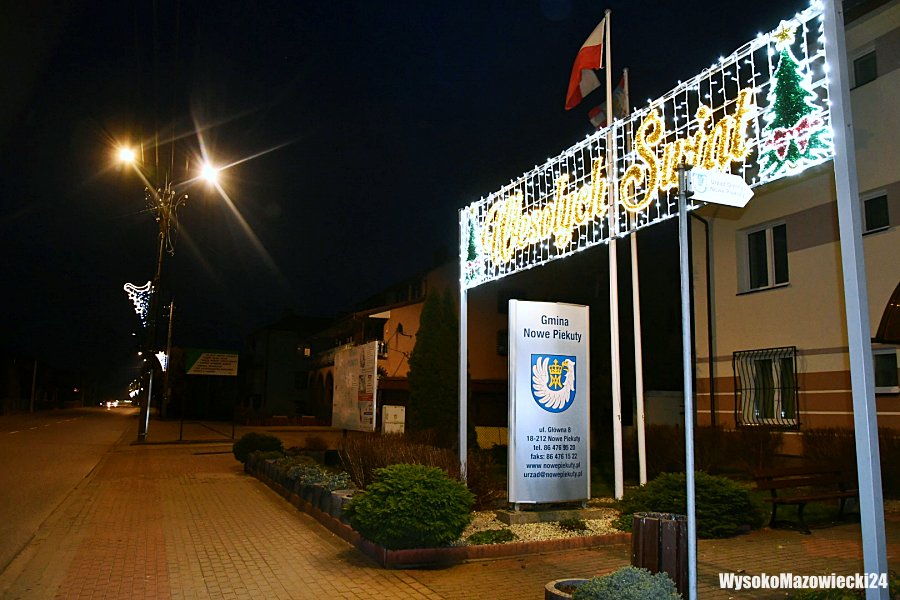 Świąteczne dekoracje rozświetliły Nowe Piekuty. Przed budynkiem Urzędu Gminy Nowe Piekuty zamontowano świetlny napis "Wesołych Świąt", który wita mieszkańców i przyjezdnych. Świąteczna iluminacja została wzbogacona o ozdoby na latarniach wzdłuż głównych ulic miejscowości.