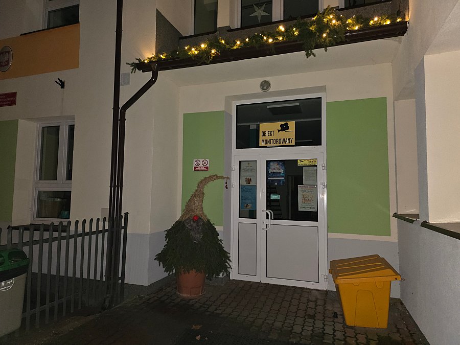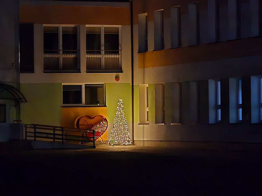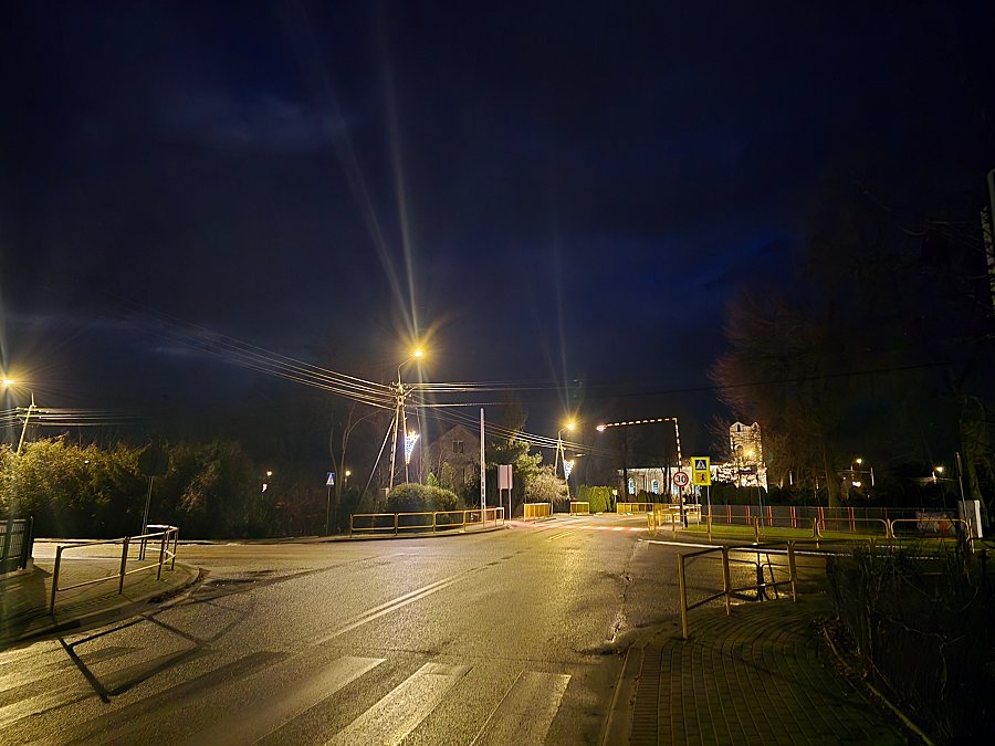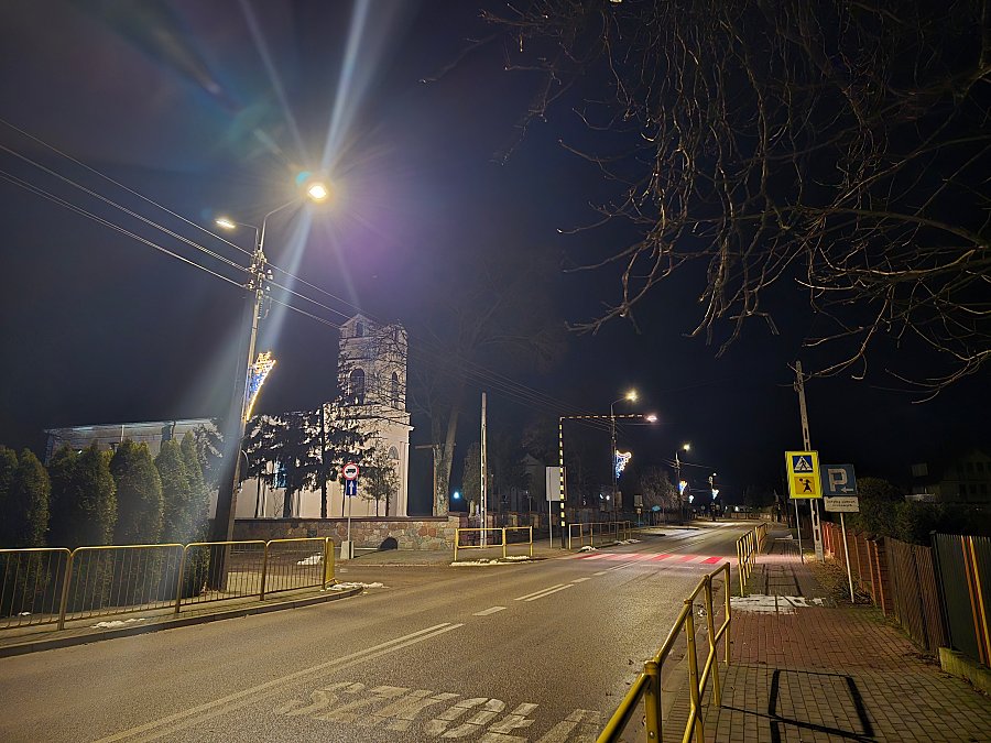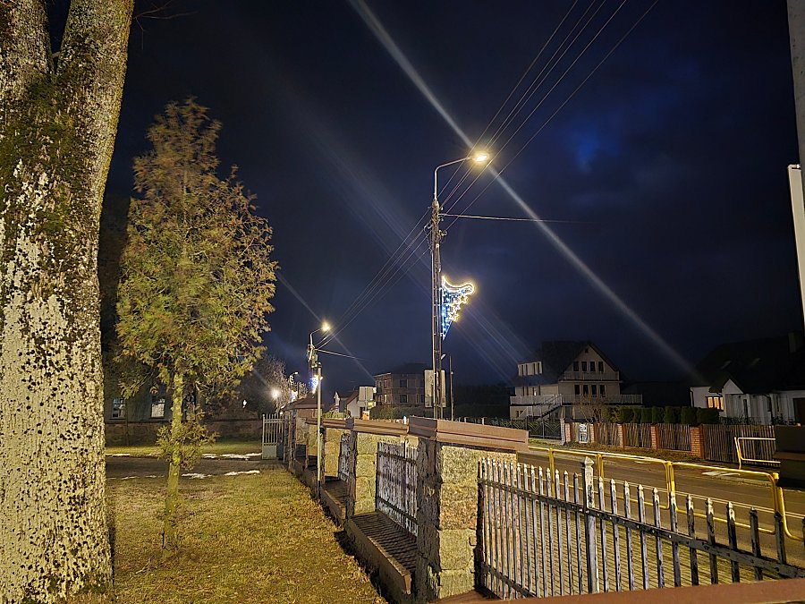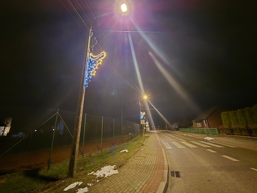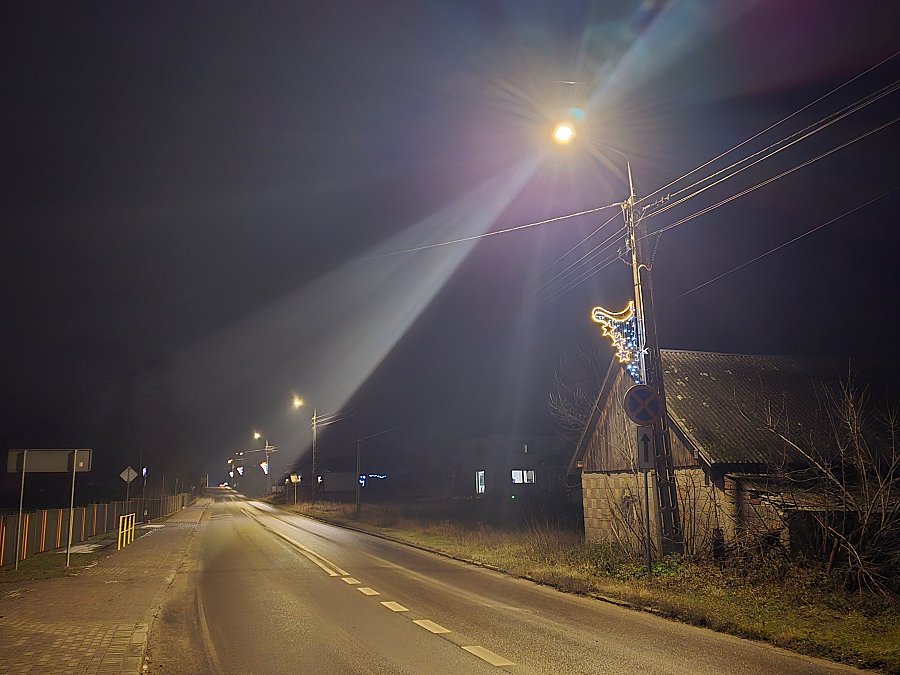 Na słupach oświetleniowych zamontowano dekoracyjne elementy w kształcie gwiazdek, które po zmroku tworzą świąteczną świetlną kompozycję.