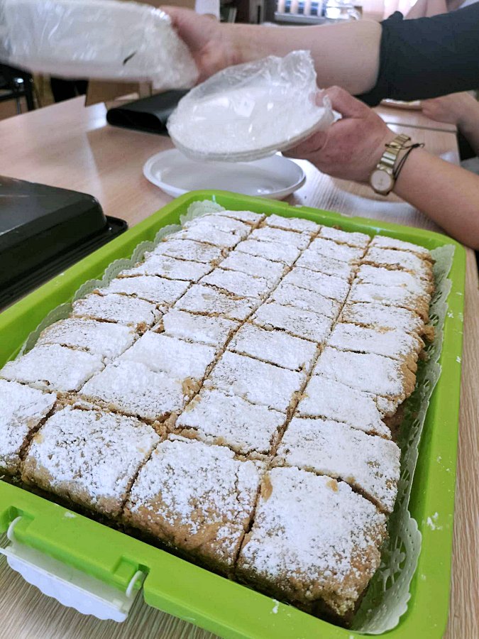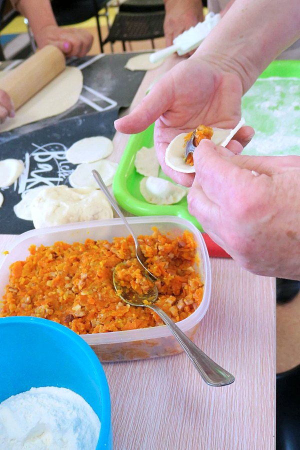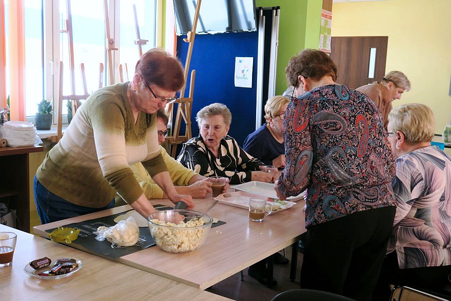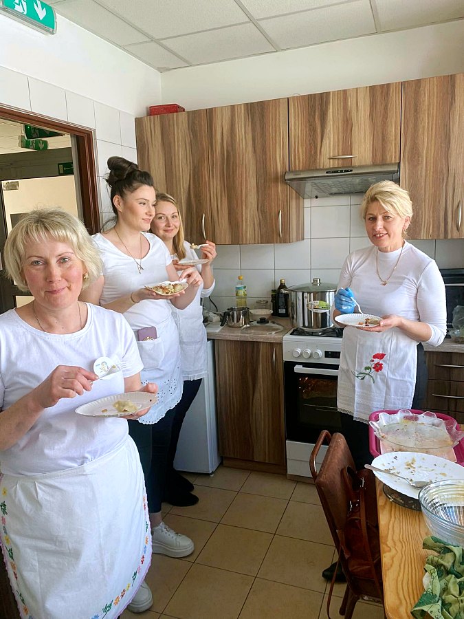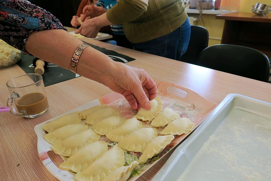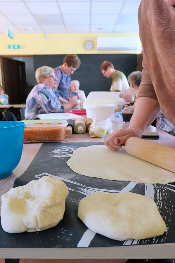Głównym punktem kulinarnego spotkania było lepienie pierogów. Uczestnicy przygotowali zarówno tradycyjne pierogi ruskie, jak i wersje z bardziej nietypowymi, w tym słodkimi farszami. Dodatkową atrakcją była wspólnie przygotowana domowa szarlotka, którą serwowano z lodami. Jak podkreślają organizatorzy, ciasto cieszyło się tak dużym powodzeniem, że szybko zniknęło ze stołu.