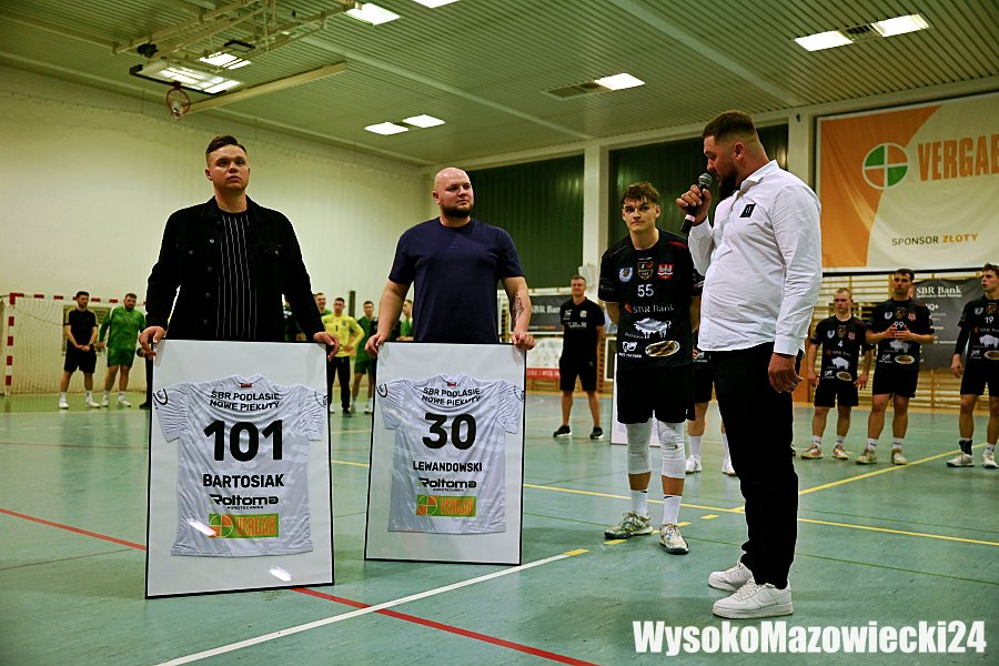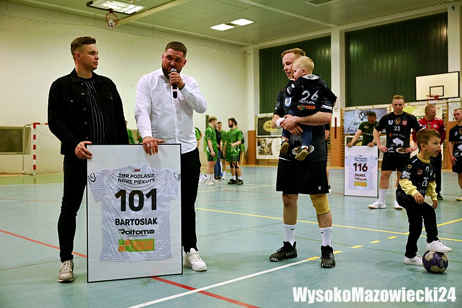 Jakub Bartosiak, prawdziwa legenda klubu, zdecydował się zawiesić buty na kołku i zakończyć swoją piękną karierę zawodniczą. Dołączył do drużyny SBR Podlasie Nowe Piekuty również w 2019 roku. W ciągu 6 lat rozegrał aż 101 meczów i zdobył 290 bramek. Bartosiak to człowiek, który nie tylko dawał z siebie wszystko na boisku, ale również poza nim - pomagał rozwijać klub pod względem organizacyjnym, finansowym i marketingowym. Podczas uroczystości pożegnalnej towarzyszyli mu synowie, którzy mimo młodego wieku są już wiernymi kibicami klubu, a w przyszłości - jak mają nadzieję działacze - być może zasilą szeregi zespołu.