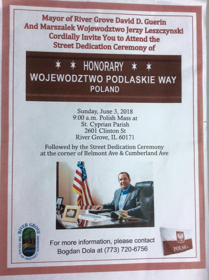 Belmont Avenue w dzielnicy River Grove w Chicago od niedzieli, 3 czerwca br. zyskał drugie, honorowe imię. Z inicjatywy Polonii związanej z naszym regionem ulica nosi nazwę Województwo Podlaskie. W uroczystościach nadania imienia wziął udział marszałek Jerzy Leszczyński.