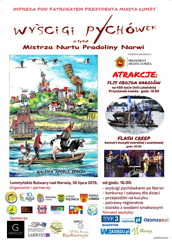 Lokalna Organizacja Turystyczna Ziemia Łomżyńska oraz MOSIR Łomża serdecznie zapraszają od godziny 16 na „wodniacki” piknik w Porcie Łomża. Jubileuszowej plenerowej imprezie wodniackiej pod patronatem Prezydenta Miasta Łomży - "Wyścigi pychówek o tytuł Mistrza Nurtu Pradoliny Narwi 2019", towarzyszyć będzie w tym roku „łomżyński” przystanek w Porcie Łomża, kilkudziesięciometrowej długości flisu - zestawu tratw z pni drzewnych - płynącego Biebrzą, Narwią i Wisłą z Goniądza do Torunia, dla uczczenia 450-lecia Unii Lubelskiej. Kultywującą kilkusetletnią tradycję załogą flisacką złożoną z podkarpackich flisaków w trakcie tego niepowtarzalnego w Polsce wydarzenia wodniackiego, dowodzić będzie europejskiej sławy retman flisacki Mieczysław Łabędzki.