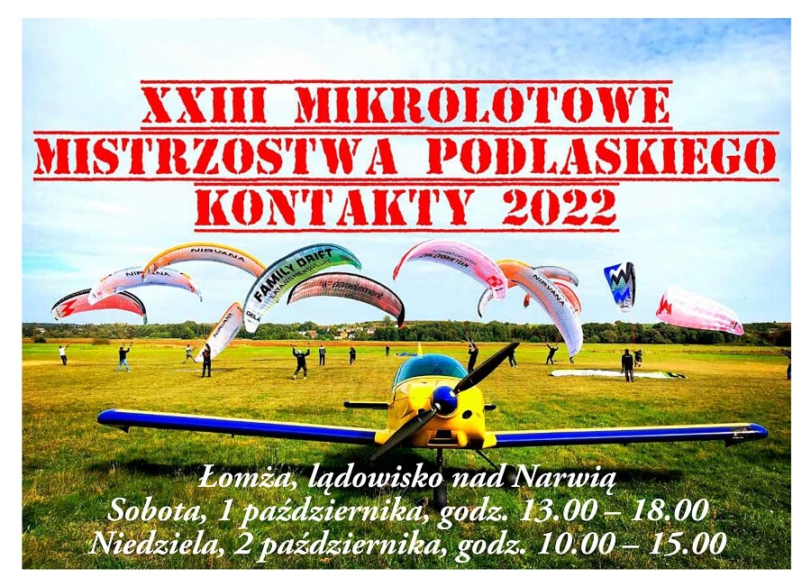 Od piątku, 1 października, do niedzieli, 3 października, przestrzeń powietrzną nad Łomżą zawładną motolotnie, paralotnie z napędem, samoloty ultralekkie, wiatrakowce! Zlecą się na XXIII Mikrolotowe Mistrzostwa Podlaskiego „Kontakty” 2021 pod auspicjami Aeroklubu Polskiego oraz patronatem marszałka województwa podlaskiego, prezydenta Łomży i wójta gminy Piątnica.