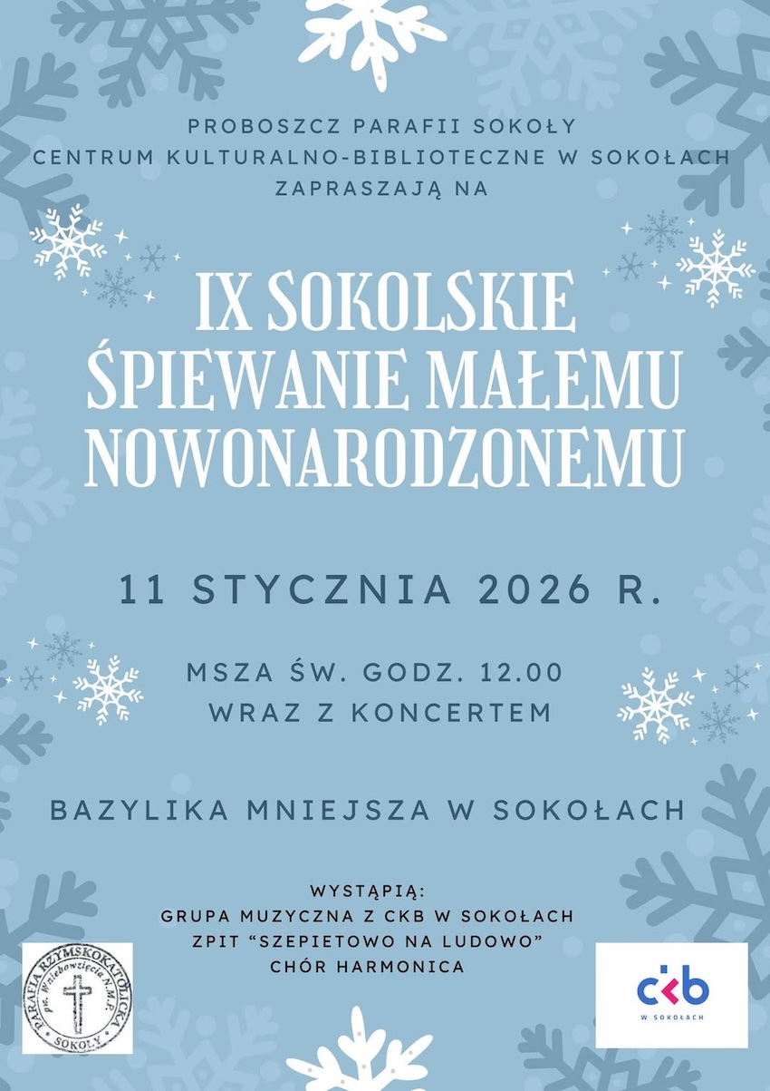 W najbliższą niedzielę w Sokołach odbędzie się dziewiąta edycja lokalnego przeglądu kolęd i pastorałek. Proboszcz parafii Sokoły oraz Centrum Kulturalno-Biblioteczne w Sokołach zapraszają na wydarzenie „Sokolskie Śpiewanie Małemu Nowonarodzonemu”, które odbędzie się w miejscowej Bazylice Mniejszej.