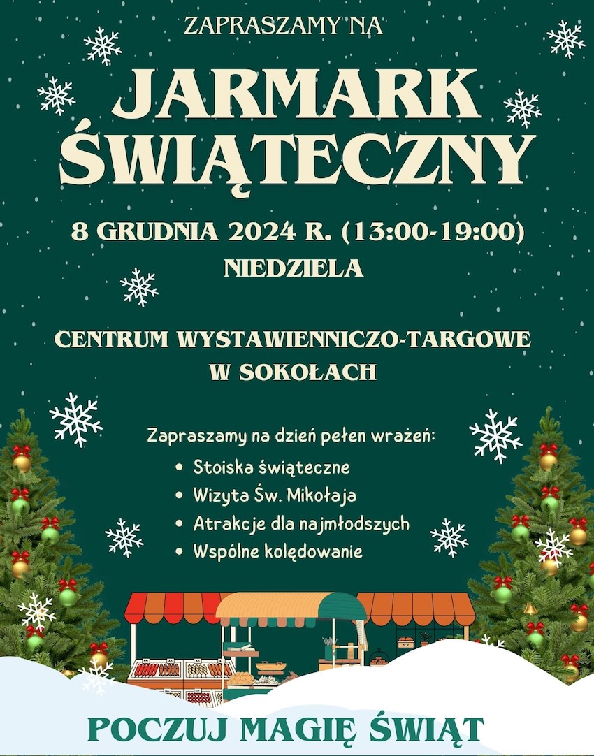 Jarmark Świąteczny odbędzie się 8 grudnia 2024 roku w Centrum Wystawienniczo-Targowym w Sokołach. Wydarzenie, organizowane przez Wójta Gminy Sokoły oraz Centrum Kulturalno-Biblioteczne w Sokołach, zaplanowano w godzinach 13:00-19:00.