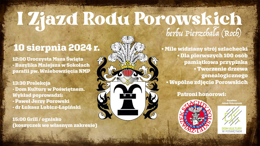 10 sierpnia 2024 roku odbędzie się I Zjazd Rodu Porowskich. Organizatorzy zapraszają wszystkich noszących to nazwisko do udziału w tym historycznym spotkaniu.