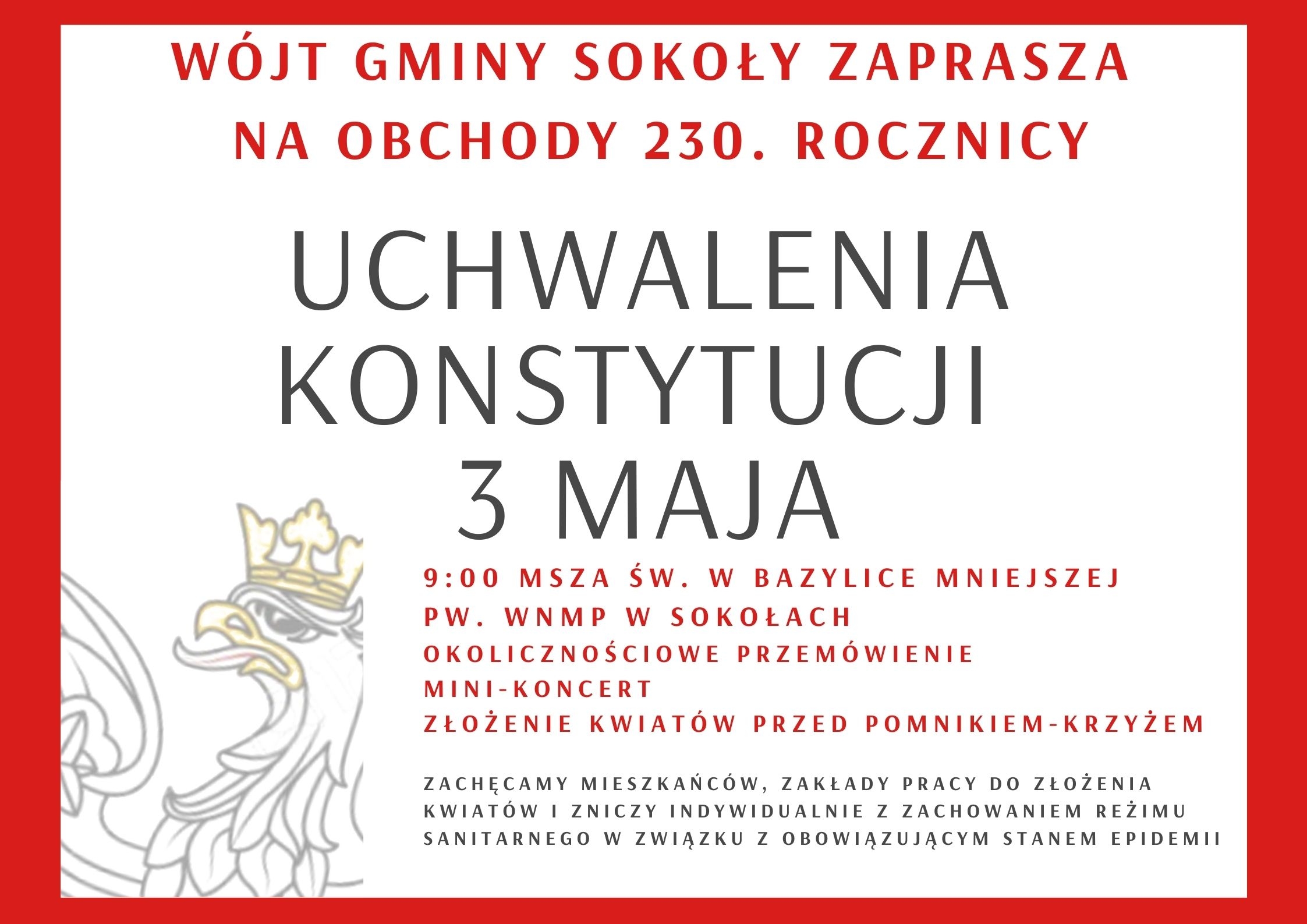 Zaproszenie na obchody 230. rocznicy uchwalenia Konstytucji 3 Maja w gminie Sokoły.