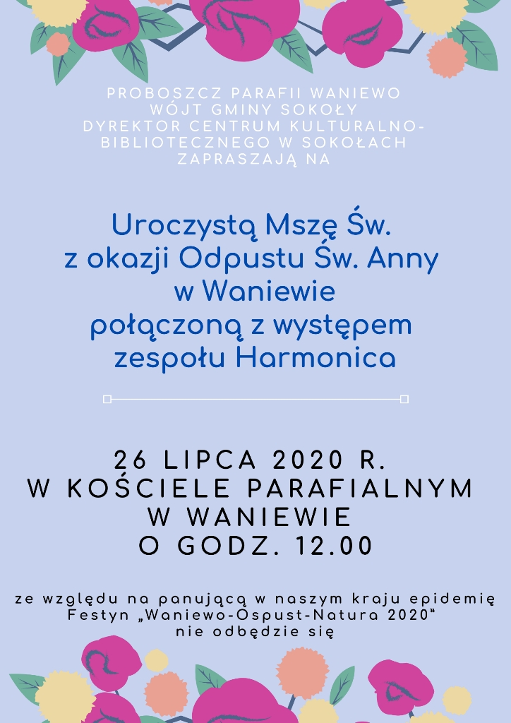 Proboszcz Parafii Waniewo, Wójt Gminy Sokoły oraz Dyrektor Centrum Kulturalno-Bibliotecznego w Sokołach zapraszają na Uroczystą Mszę Św. z okazji Odpustu Św. Anny w Waniewie.