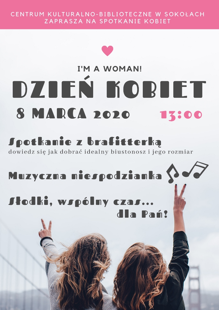 Centrum Kulturalno - Biblioteczne w Sokołach zaprasza w niedzielę, 8 marca na spotkanie z okazji Dnia Kobiet. Hasło przewodnie imprezy brzmi: „I’m a woman”. Początek o godzinie 13.00.