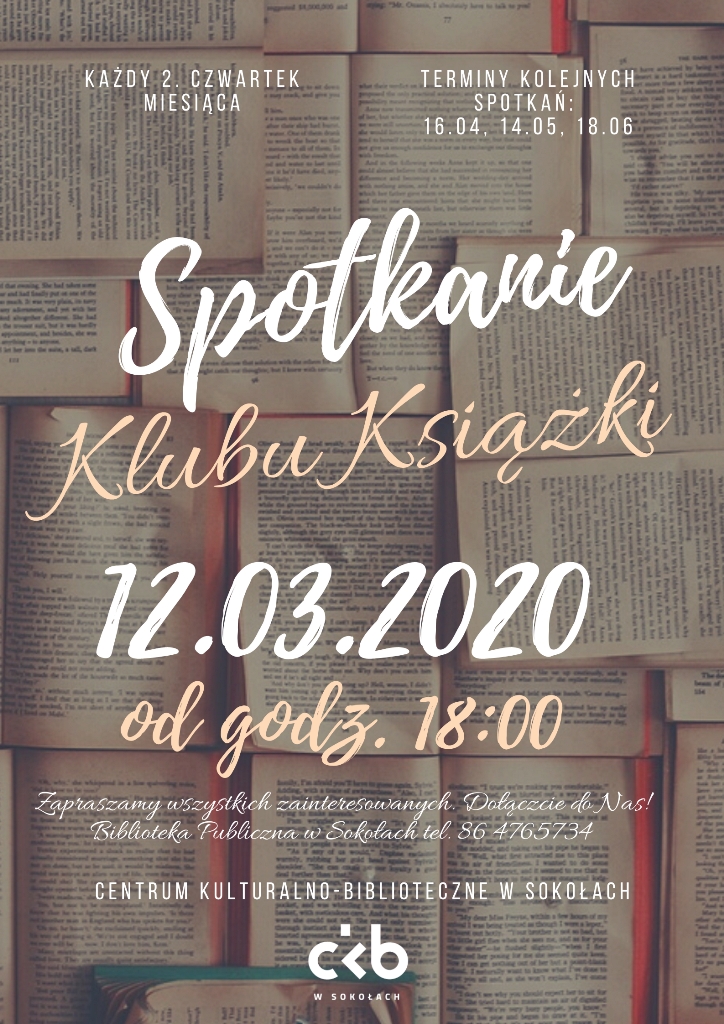 Centrum Kulturalno - Biblioteczne w Sokołach zaprasza na spotkanie Klubu Książki, które odbędzie się w czwartek, 12 marca. Początek o godzinie 18:00.