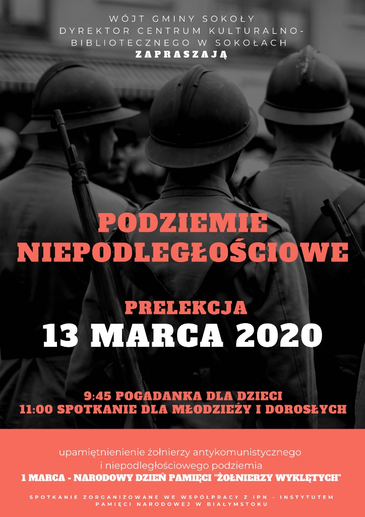 Wójt Gminy Sokoły oraz Dyrektor Centrum Kulturalno – Bibliotecznego w Sokołach zapraszają na prelekcję „Podziemie niepodległościowe”.