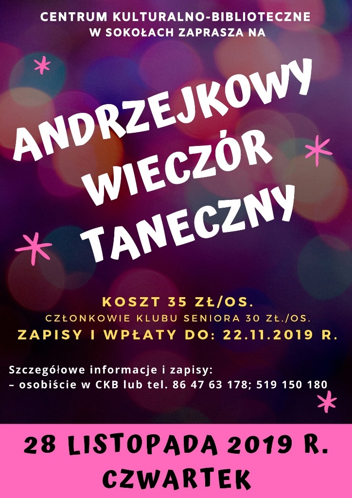 Centrum Kulturalno - Biblioteczne w Sokołach zaprasza na "Andrzejkowy wieczór taneczny", który odbędzie się w czwartek, 28 listopada.