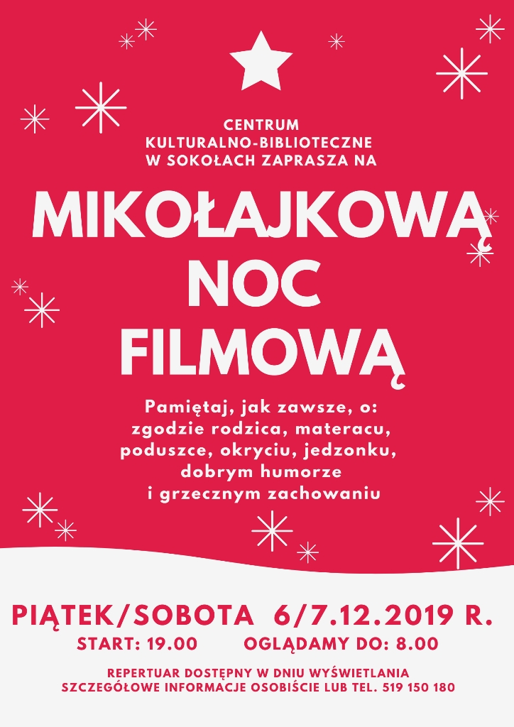 Centrum Kulturalno – Biblioteczne w Sokołach zaprasza na „Mikołajkową noc filmową”.