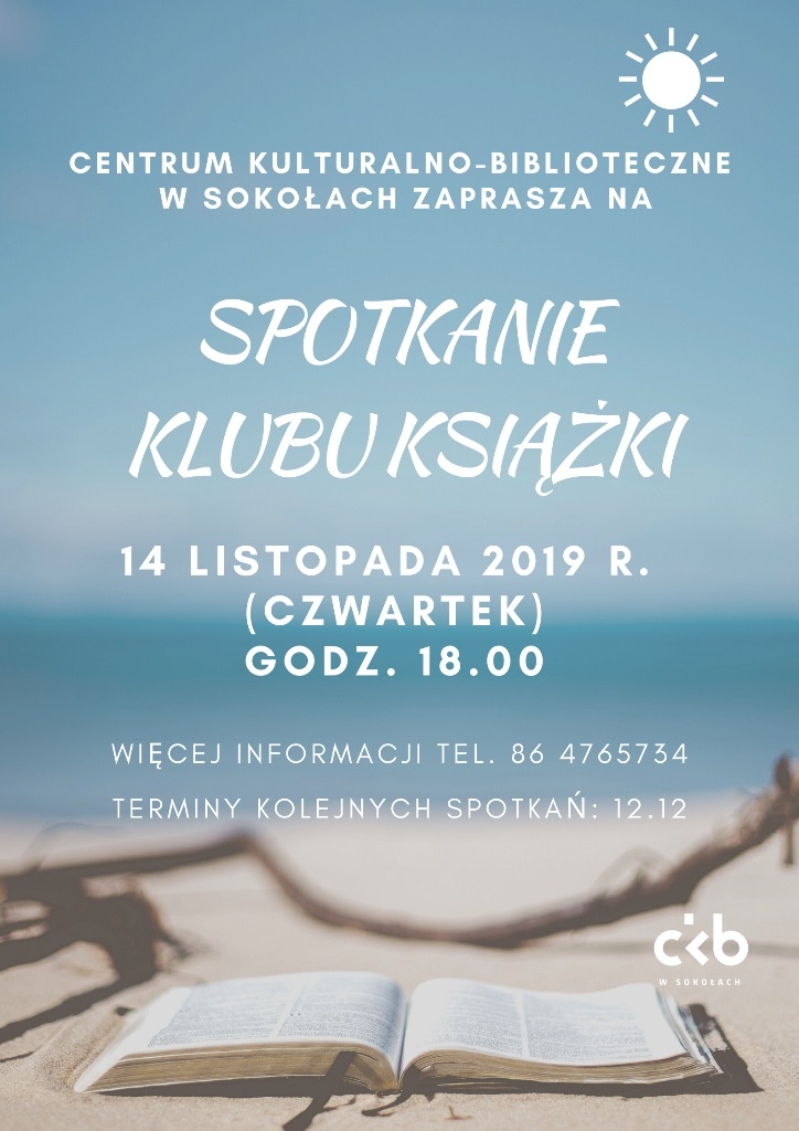 Centrum Kulturalno - Biblioteczne w Sokołach zaprasza na spotkanie Klubu Książki, które odbędzie się w najbliższy czwartek, 14 listopada. Początek o godzinie 18:00.