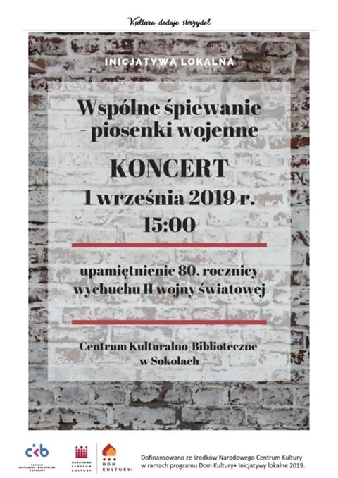 Centrum Kulturalno - Biblioteczne w Sokołach serdecznie zaprasza na koncert upamiętniający 80. rocznicę wybuchu II Wojny Światowej.
