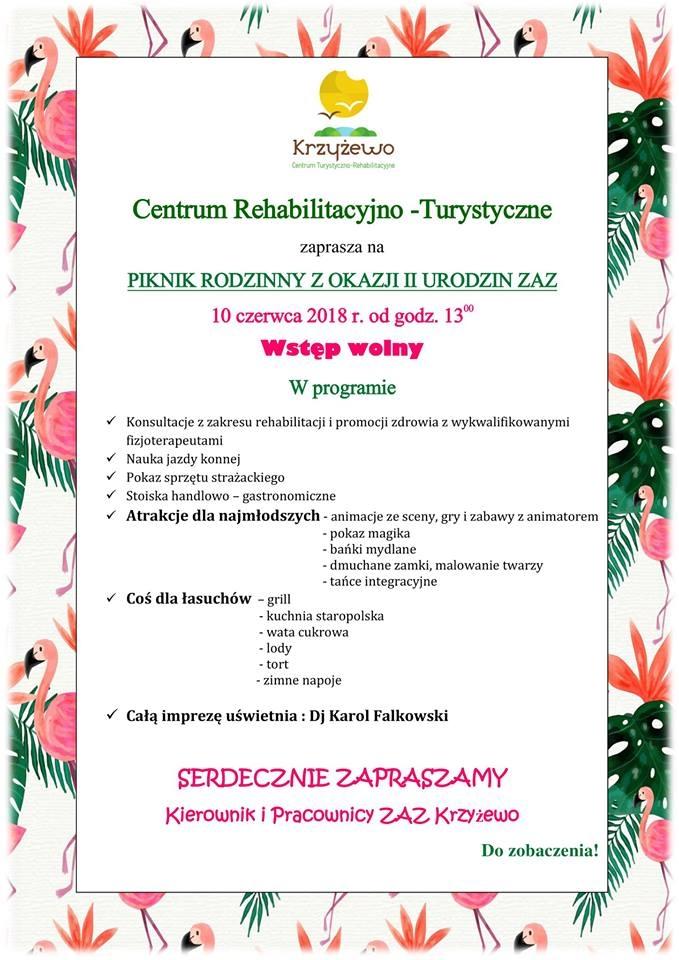 Centrum Turystyczno-Rehabilitacyje ZAZ Krzyżewo serdecznie zaprasza na Piknik Rodzinny z okazji II Urodzin.
