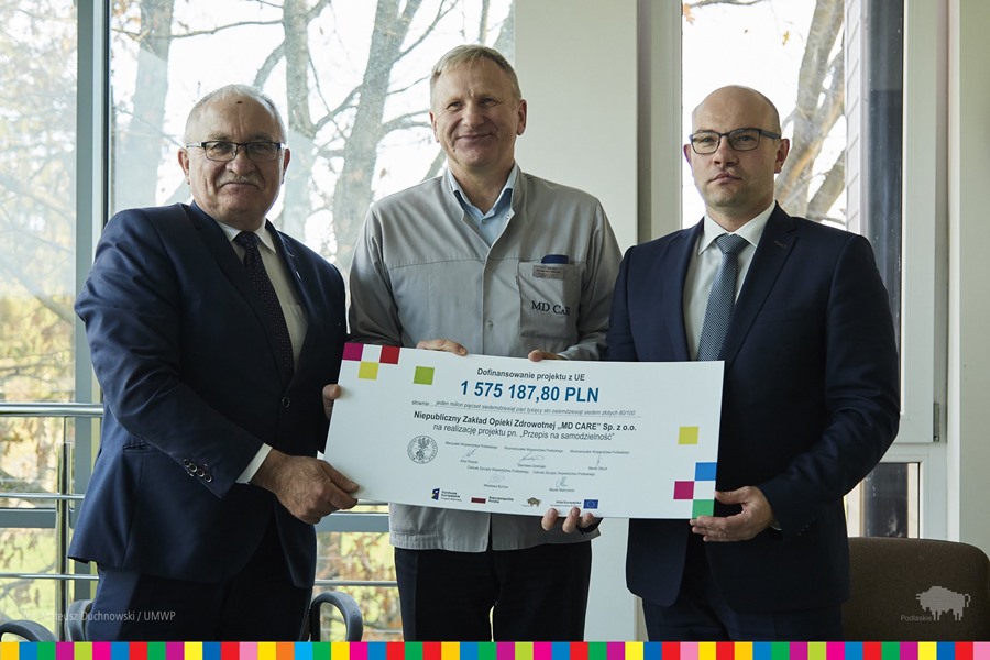 W dniu dzisiejszym (30.10) w Centrum Rehabilitacji NZOZ MD CARE w Dworakach – Staśkach (gmina Sokoły) podpisano umowę na realizację projektu „Przepis na samodzielność”. Uzyskał on dofinansowanie z funduszy UE w wysokości prawie 1,6 mln zł. Dzięki niemu pomoc w postaci usług asystenckich i możliwości korzystania z bezpłatnej wypożyczalni sprzętu pielęgnacyjnego otrzyma 80 osób niepełnosprawnych z gmin: Białystok, Choroszcz, Czarna Białostocka, Juchnowiec Kościelny, Łapy, Supraśl, Turośń Kościelna, Zabłudów, Dobrzyniewo Duże, Wasilków.