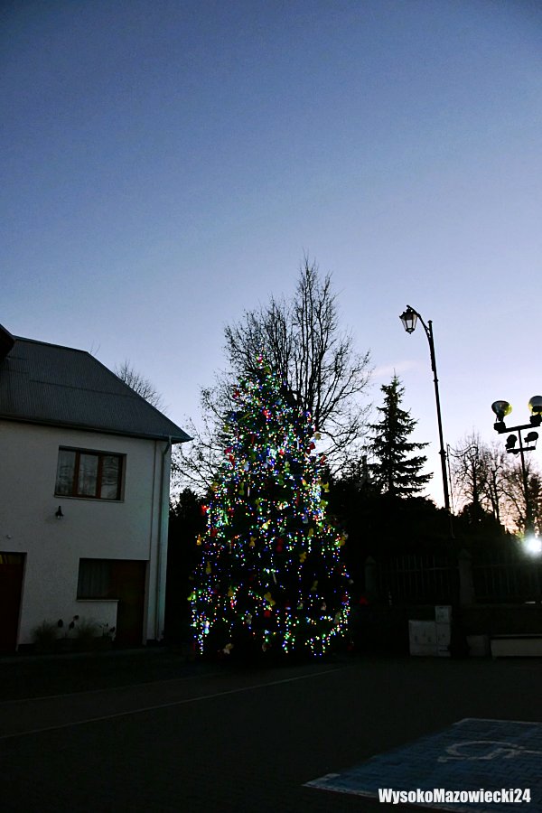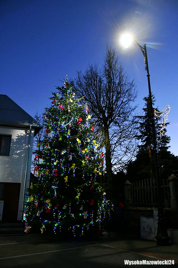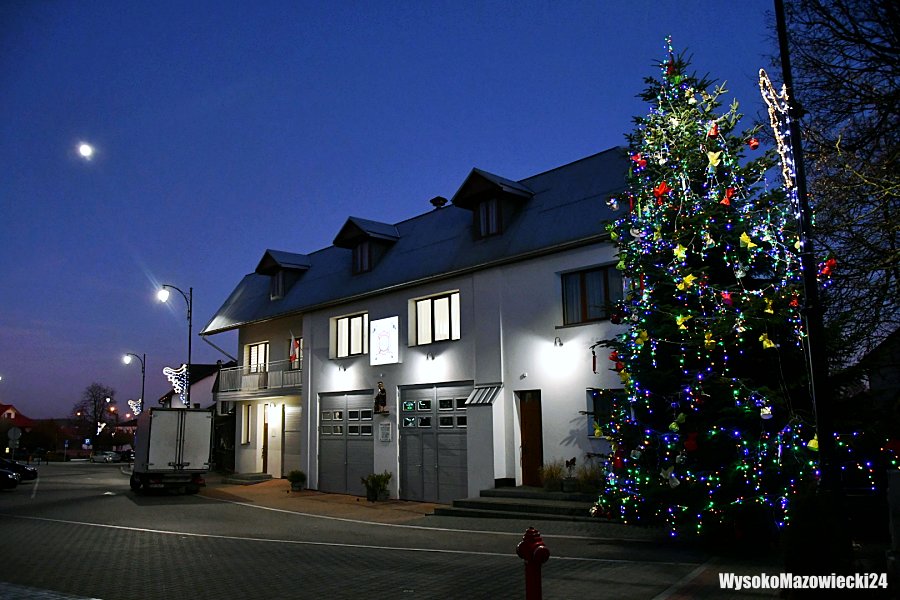 Przed remizą Ochotniczej Straży Pożarnej w Sokołach stanęła tradycyjnie duża, bogato przystrojona choinka. Drzewo zostało udekorowane kolorowymi lampkami i ozdobami, które pięknie komponują się z pozostałymi elementami świątecznej iluminacji.