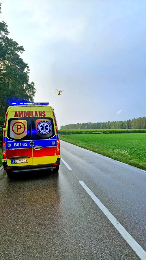 Na miejsce wypadku natychmiast zostały skierowane liczne siły ratunkowe - zespoły ratownictwa medycznego, cztery zastępy straży pożarnej: dwa z JRG Wysokie Mazowieckie oraz dwa z OSP KSRG Sokoły, śmigłowiec Lotniczego Pogotowia Ratunkowego oraz policjanci z Komendy Powiatowej Policji w Wysokiem Mazowieckiem. Stan zdrowia 23-letniego kierowcy wymagał pilnej interwencji medycznej i transportu helikopterem do specjalistycznego ośrodka medycznego.