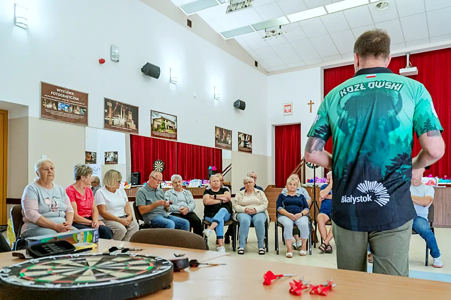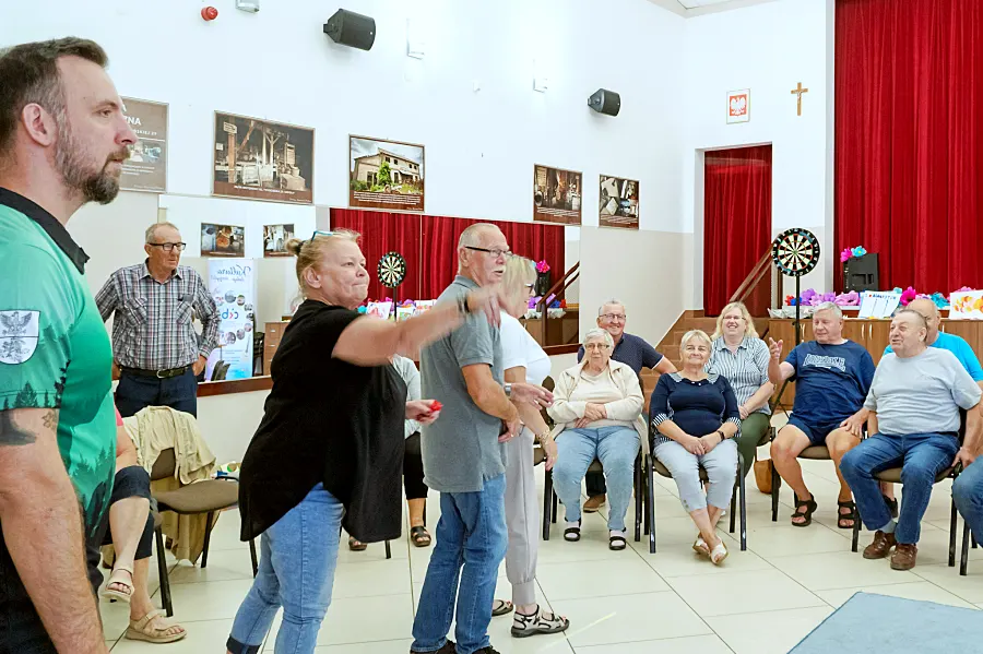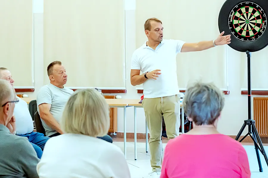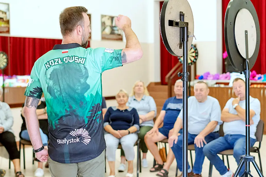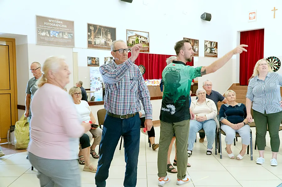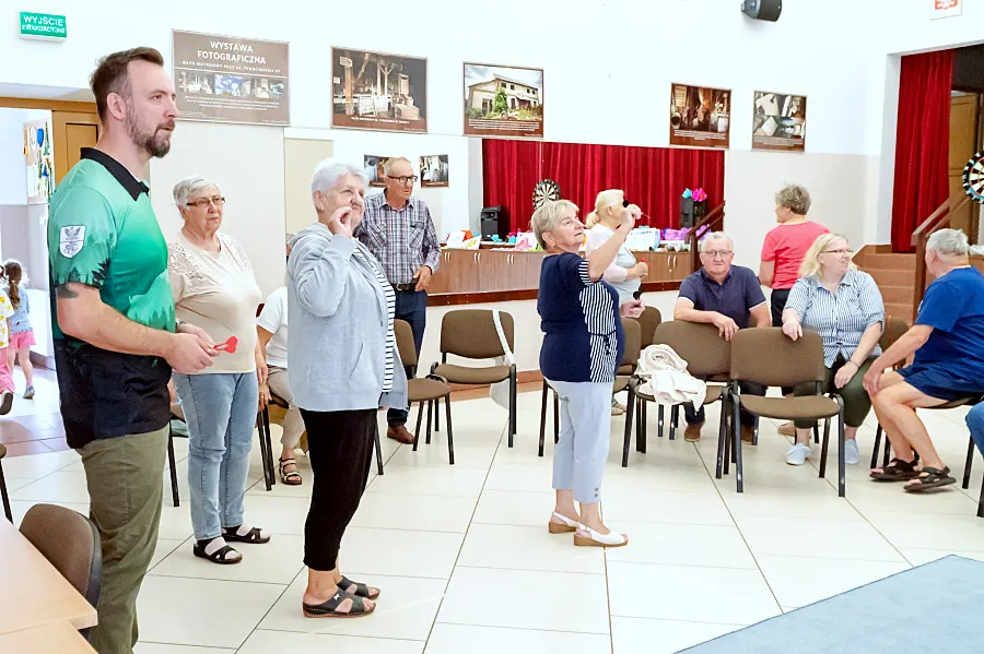 Członkowie Klubu Seniora w Sokołach spędzili minioną sobotę, 23 sierpnia, w nietypowy i aktywny sposób. Tego dnia zorganizowano dla nich specjalne warsztaty połączone z turniejem darta, popularnie znanego jako gra w lotki. Spotkanie, które obfitowało w nowe doświadczenia i sportowe emocje, poprowadził profesjonalny trener i zawodnik, Marcin Kozłowski.