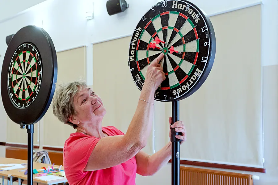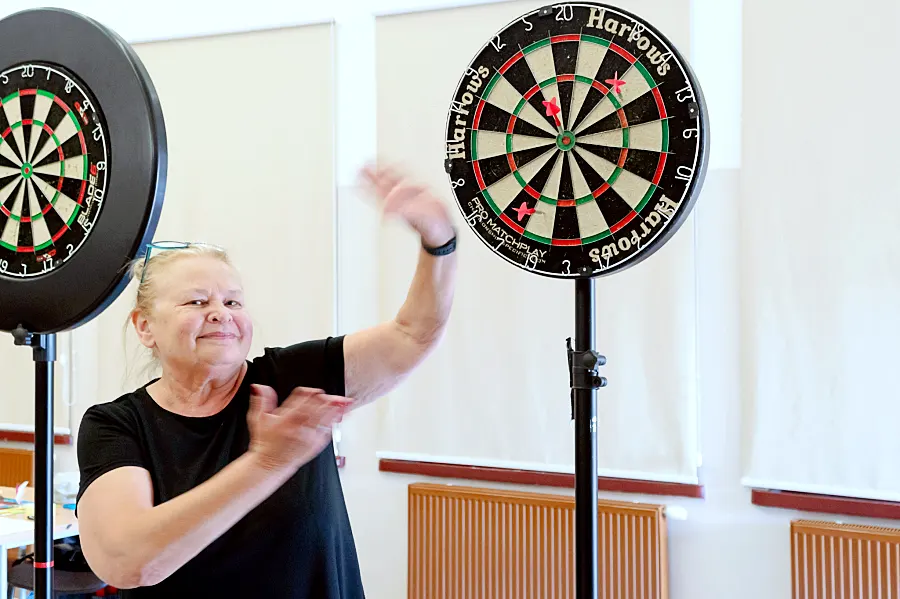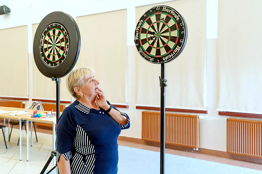 Po teorii przyszedł czas na praktykę. Dla zdecydowanej większości uczestników był to pierwszy kontakt z profesjonalnymi lotkami, dlatego początkowe próby rzutów do tarczy wywoływały zarówno stres, jak i mnóstwo śmiechu. Pod czujnym okiem trenera seniorzy szybko nabierali wprawy, przygotowując się do punktu kulminacyjnego spotkania – turnieju.
