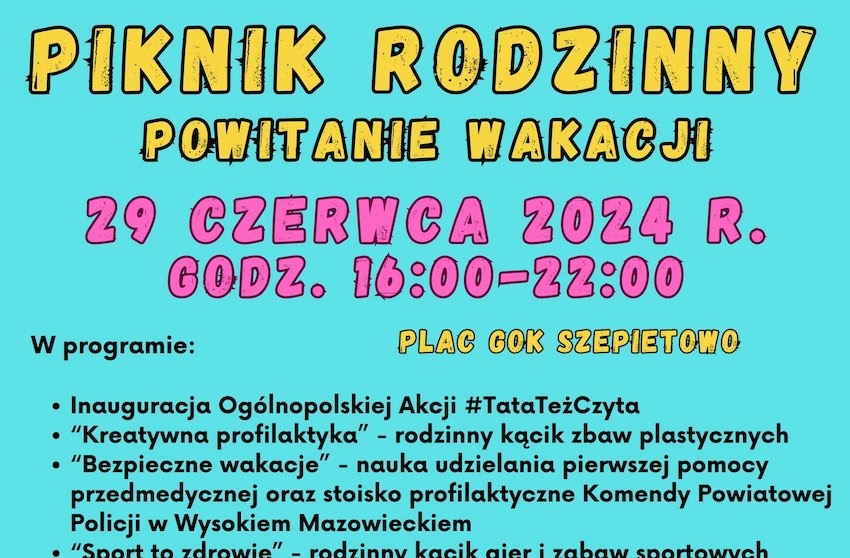 W sobotę, 29 czerwca, o godzinie 16:00 na placu przy Gminnym Ośrodku Kultury w Szepietowie rozpocznie się "Piknik rodzinny - powitanie wakacji". Organizatorzy zapraszają całe rodziny do wspólnego świętowania początku wakacji, oferując bogaty program atrakcji. Organizatorzy zachęcają do zabrania ze sobą kocyków i koszy piknikowych.