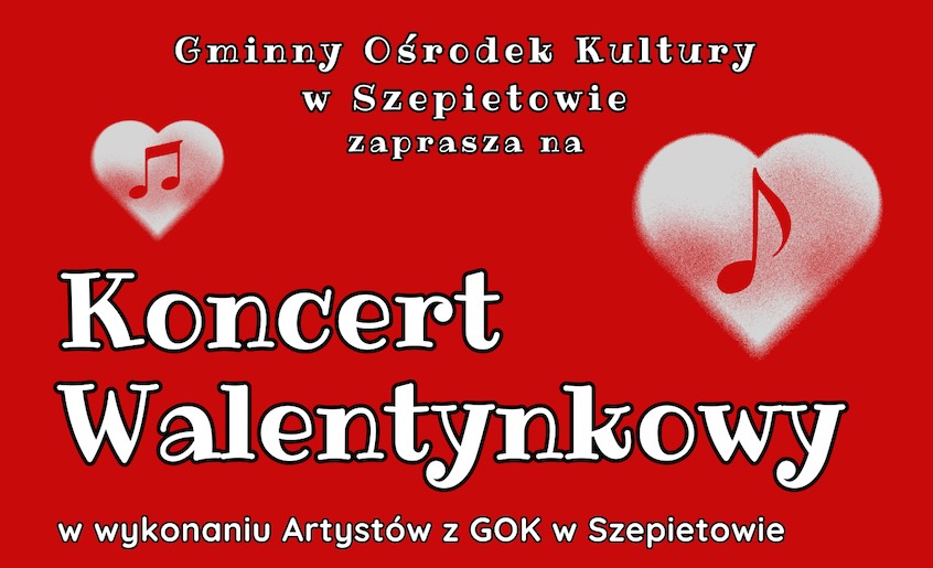 Gminny Ośrodek Kultury w Szepietowie zaprasza na Koncert Walentynkowy, który odbędzie się w dniu 11 lutego br. (niedziela) o godz. 15.00.