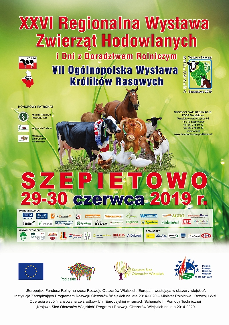 Kilkuset wystawców krajowych i zagranicznych, około 1000 zwierząt hodowlanych, dwa dni wypełnione pokazami, konkursami spotkaniami edukacyjnymi i handlowymi – tak w dużym skrócie przedstawia się program największego w północno-wschodniej Polsce wydarzenia z branży rolniczej. Regionalna Wystawa Zwierząt Hodowlanych odbędzie się 29-30 czerwca 2019 roku w Podlaskim Ośrodku Doradztwa Rolniczego w Szepietowie.