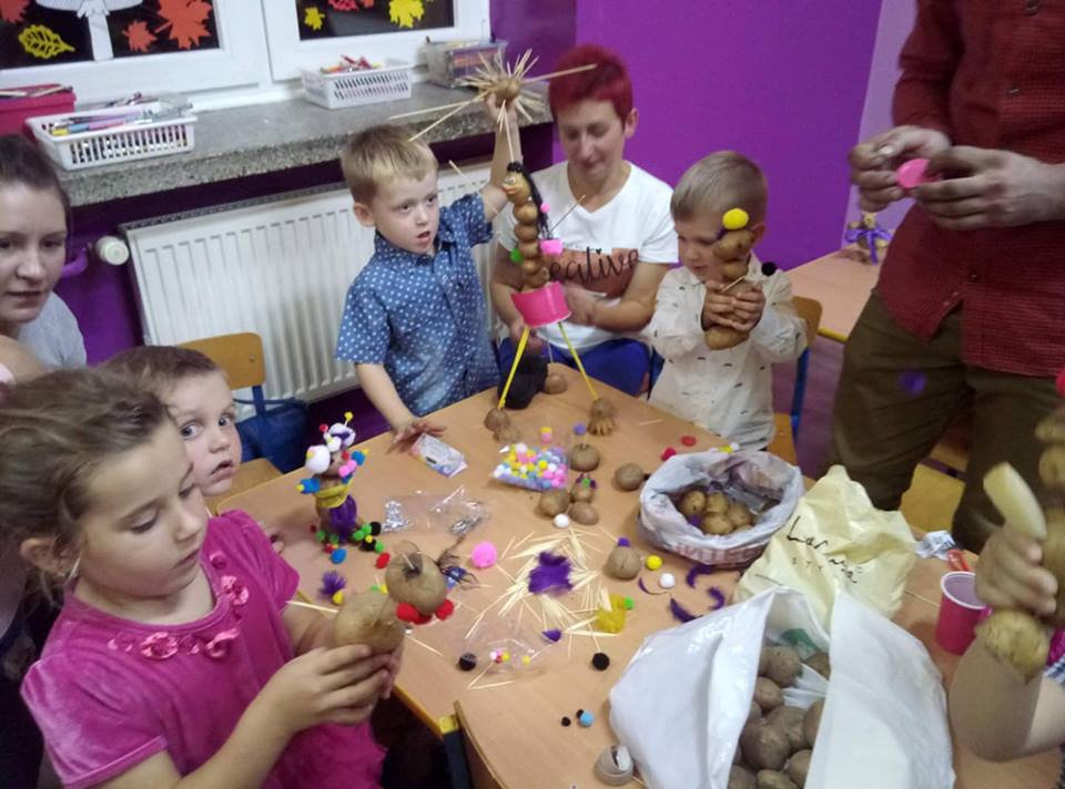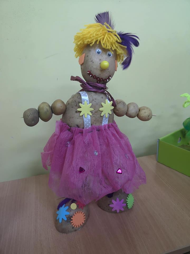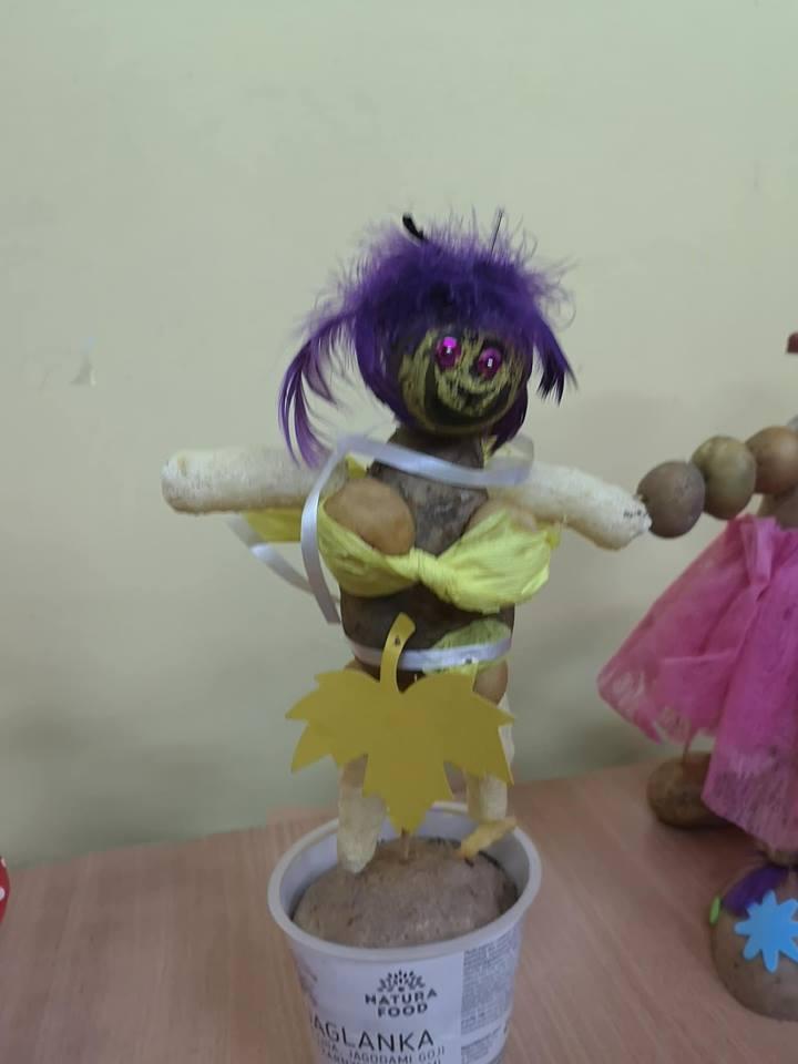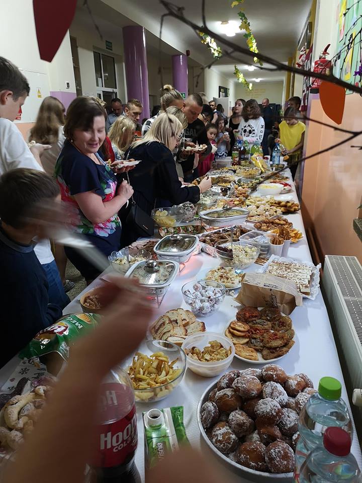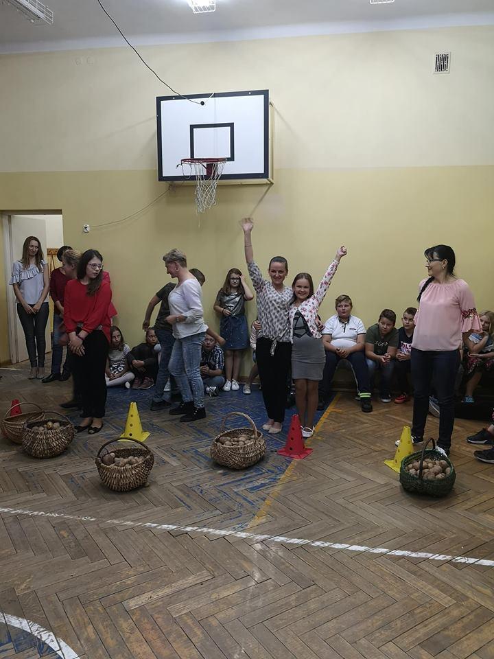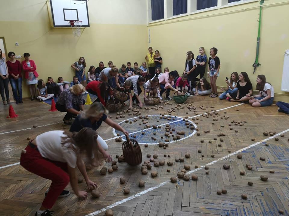 Stoły uginały się od potraw przygotowanych przez mamy i babcie. Na półmiskach królowały oczywiście ziemniaki. Nie zabrakło pysznych bab i kiszek, placków ziemniaczanych, frytek, kartaczy czy kopytek. Były nawet pączki z ziemniaków. Uczniowie z klas 0-III przy pomocy rodziców mogli wykazać się kreatywnością tworząc ziemniaczane ludziki. Starsi uczniowie ze swoimi rodzicami stanęli do rywalizacji sportowej. Obchody Święta Ziemniaka zakończyliśmy dyskoteką.