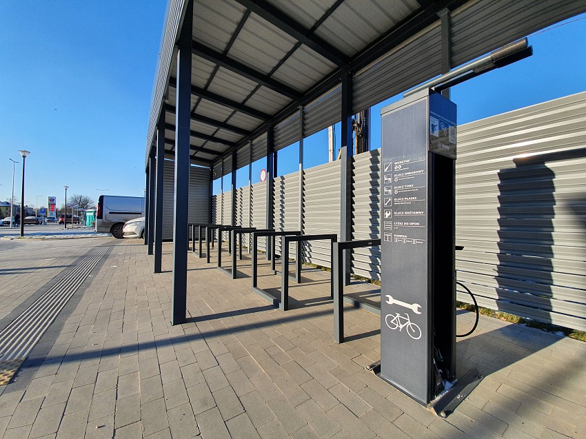 Całkowicie przearanżowano teren wokół dworca. Ułożono tam nową nawierzchnię oraz zamontowano elementy małej architektury, tj. ławki, kosze czy lampy oświetleniowe. Uporządkowano zieleń oraz wyznaczono dwa miejsca postojowe dla osób z niepełnosprawnościami. Nowością w otoczeniu dworca jest wiata rowerowa ze stojakami dla jednośladów i stacją ich napraw.