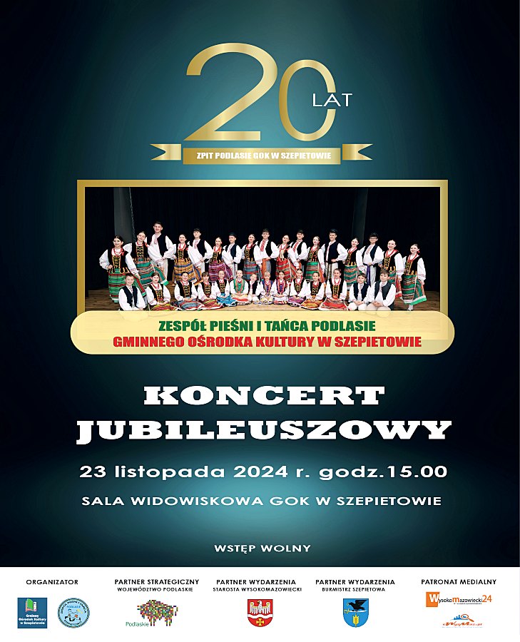Zespół Pieśni i Tańca PODLASIE z Szepietowa przygotowuje się do jubileuszu 20-lecia działalności. Koncert Jubileuszowy odbędzie się już w sobotę, 23 listopada 2024 roku o godzinie 15:00 w sali widowiskowej Gminnego Ośrodka Kultury w Szepietowie.